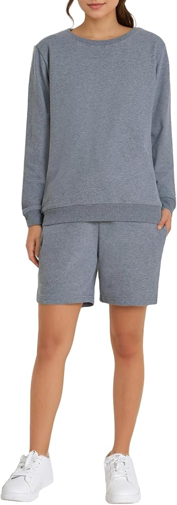 Matching sweatshirt and shorts set is a good alternative as sweat outfits and activewear sets for workout, or as pajama set and loungewear sets for sleeping in, lounging around the house, doing chores etc