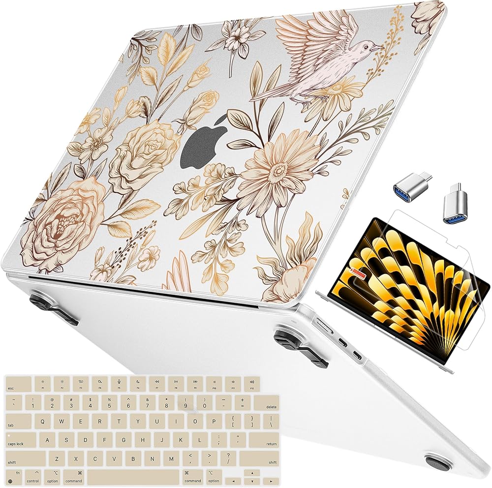 Mektron Ultra Thin Armor Case Compatible with MacBook Air 13.6 inch Printed Cover 2025-2022 M4 M3 M2 A3240 A3113 A2681, Protective Hard Shell with Fold Kickstand, Floral P314