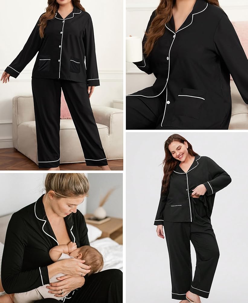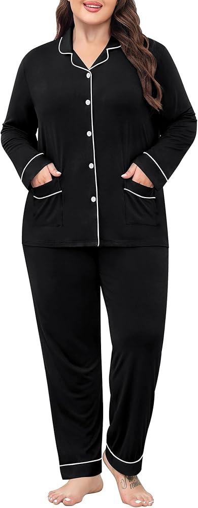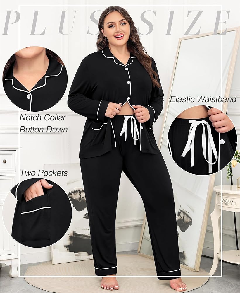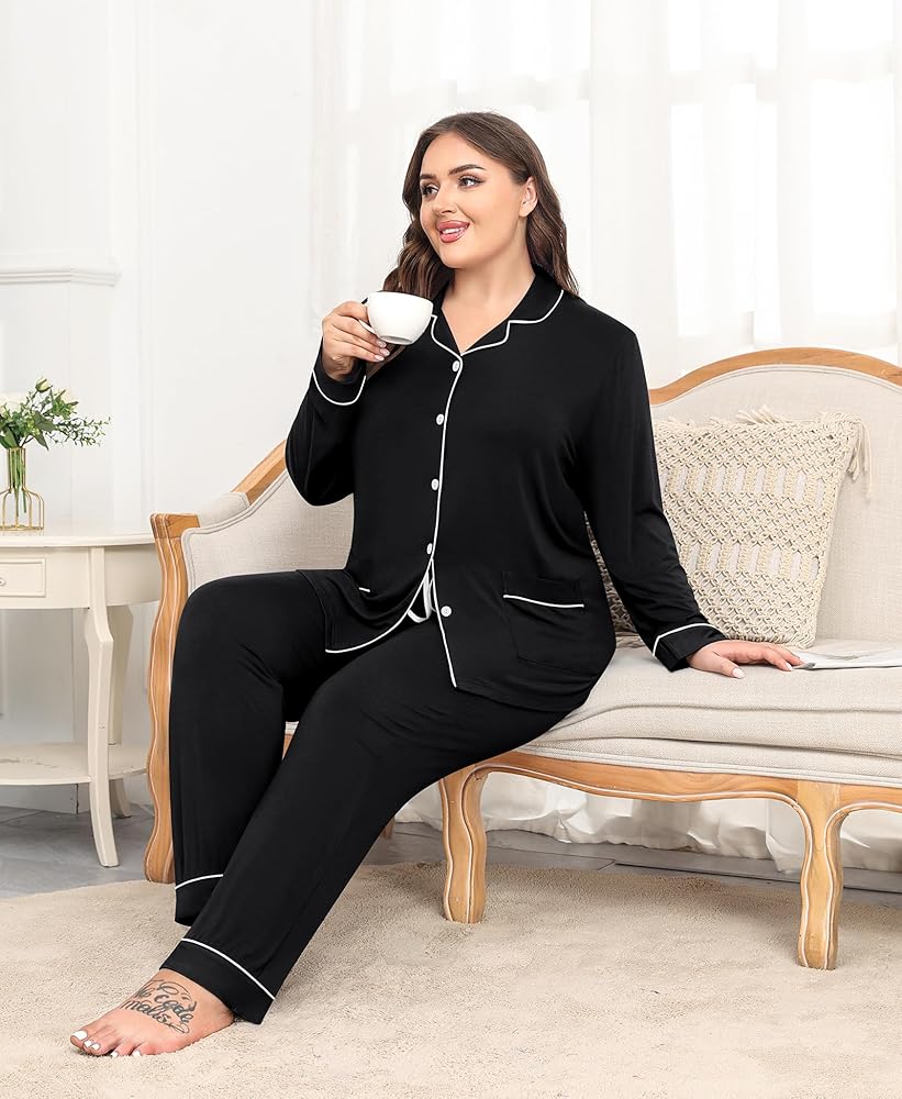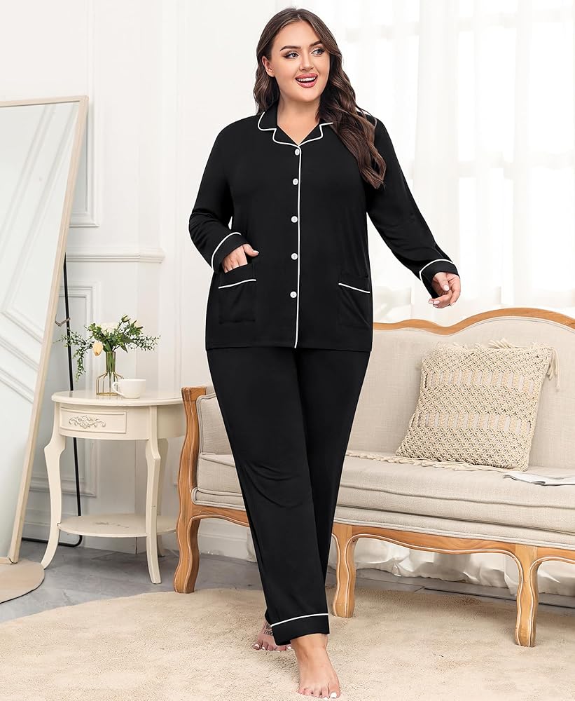 ❤【Stylish Plus Size Pajama】The plus size pjs tops features two convenient pockets. Sleepwear with pockets to place your phone and wallet, keep your hands free. Classic pajamas featuring notch collar and contrast piping trim.The full button is easy to put on and take off, and can also be used for postpartum breastfeeding. Pajama pants with elastic drawstring waist fit for your body.
