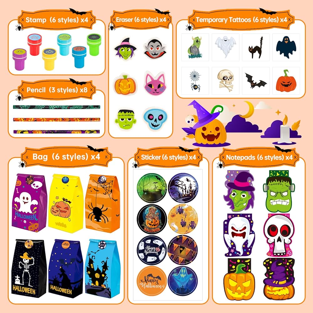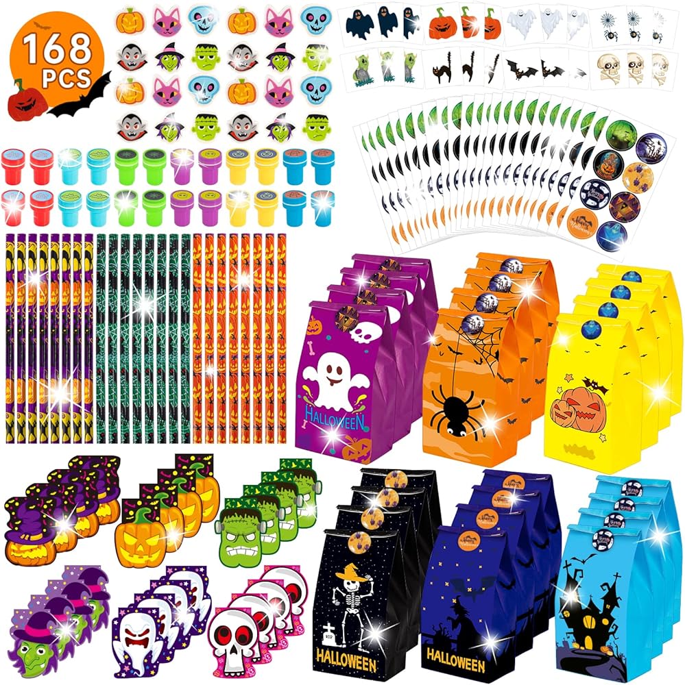 168PCS Halloween Party Favor Goodie Bag Bulk for Kids, Halloween Stationery Set, Trick or Treat Toys including Pencil, Eraser, Notepad, Stamper, Halloween Bag, Stickers and Temporary Tattoos