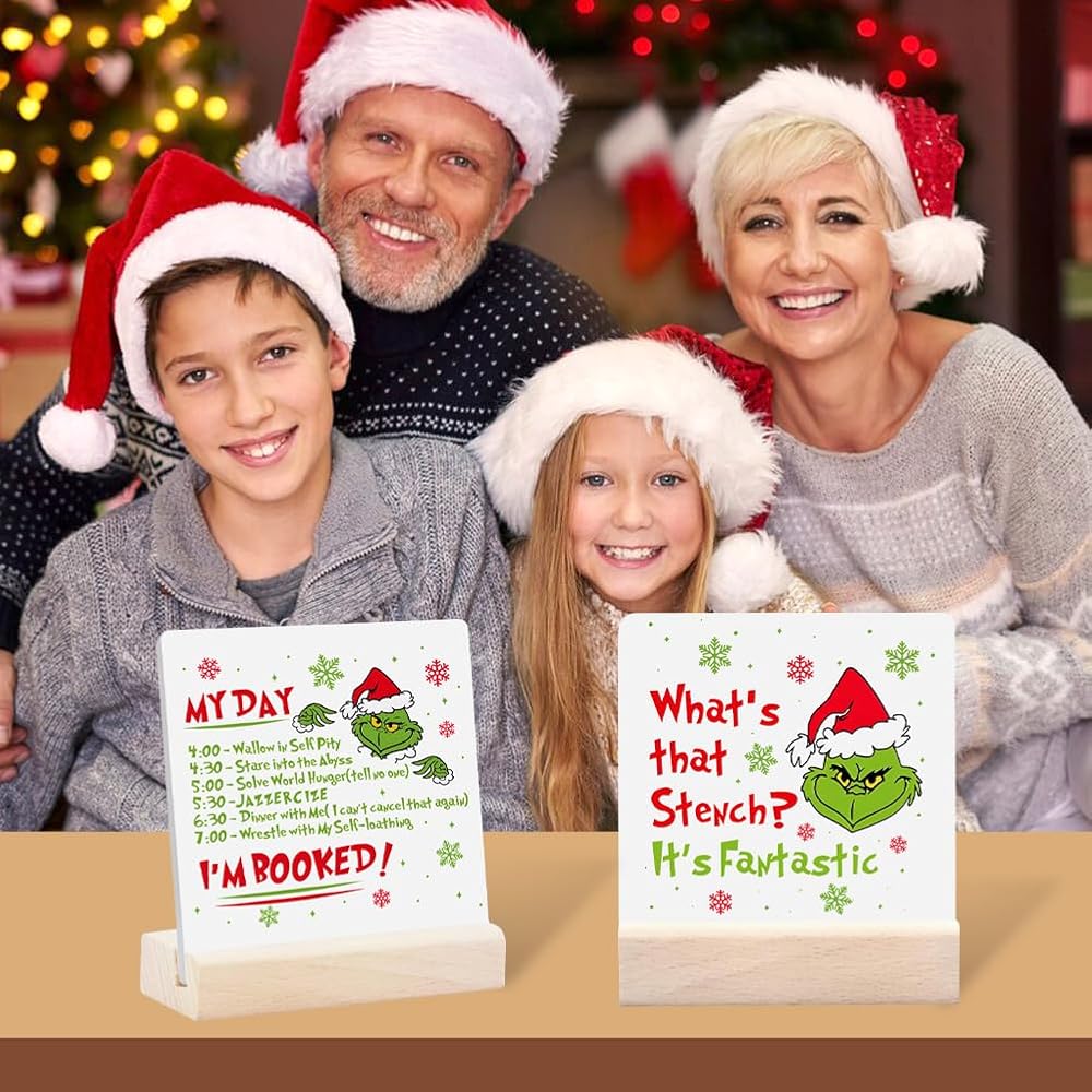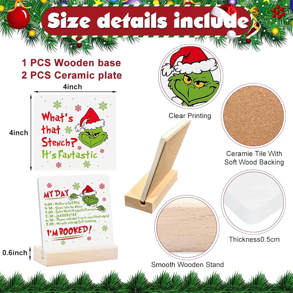 Christmas Decorations, 2 Ceramic Print Signs with 1 Wood Stand Desktop Ornament, Christmas Sign Table Tiered Tray Winter Centerpiece Party Decor for Dinner Coffee Holiday Vacation Home 4.4x4 inch