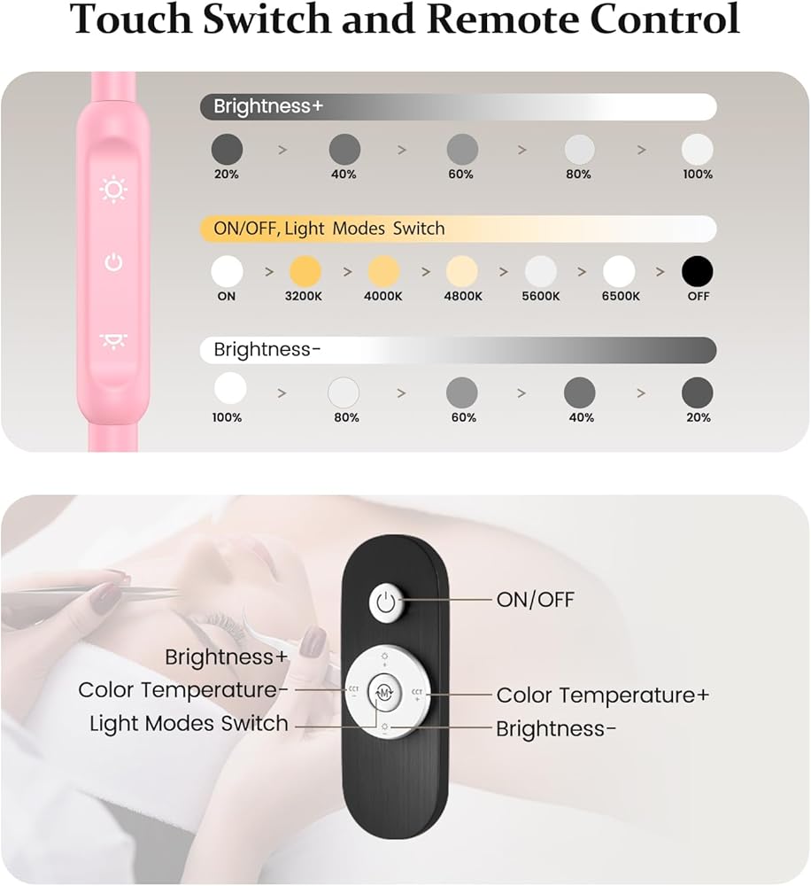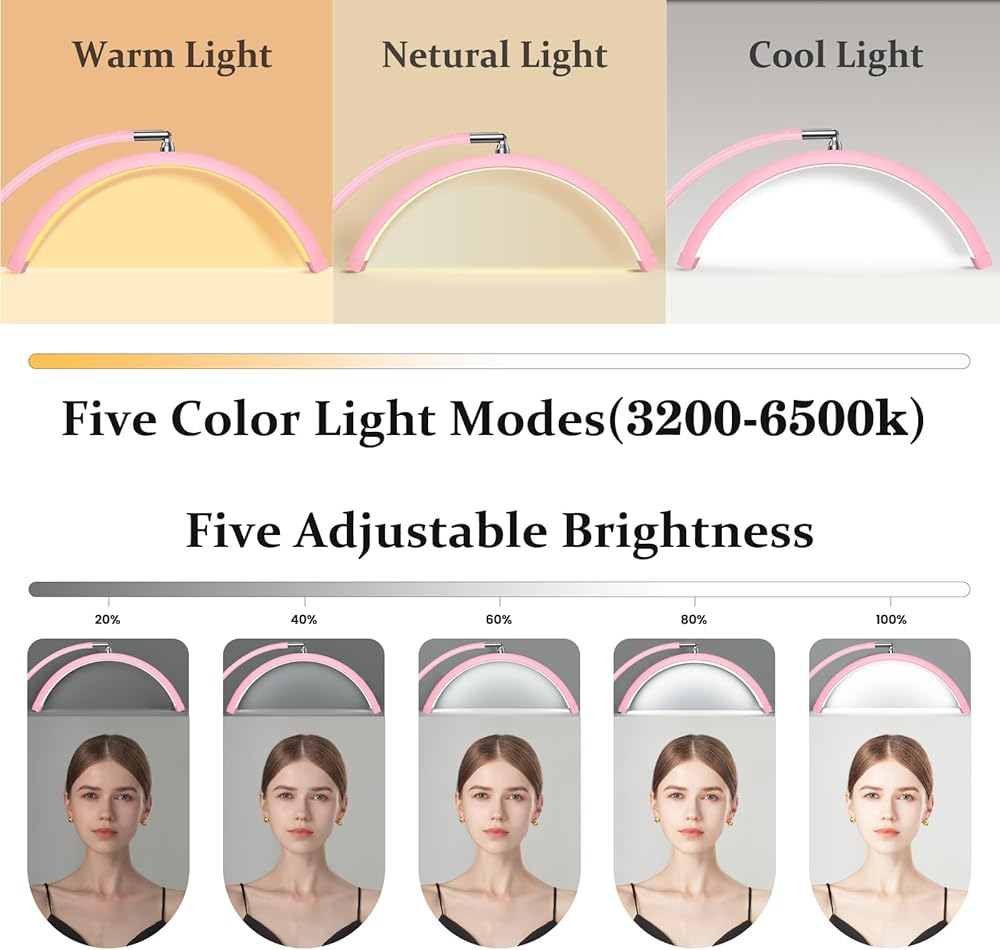 【Professional Floor-standing Light】If you are looking for a floor-standing work lamp for your studio, Mznoo half moon light should be your choice. With five color modes from warm to cool (3200K, 4000K, 4800K, 5600K, 6500K), and five brightness levels, you will have 25 lighting combinations to meet your needs. This half moon light would be a nice light source for the lash light, nail light, tattoo light, etc.