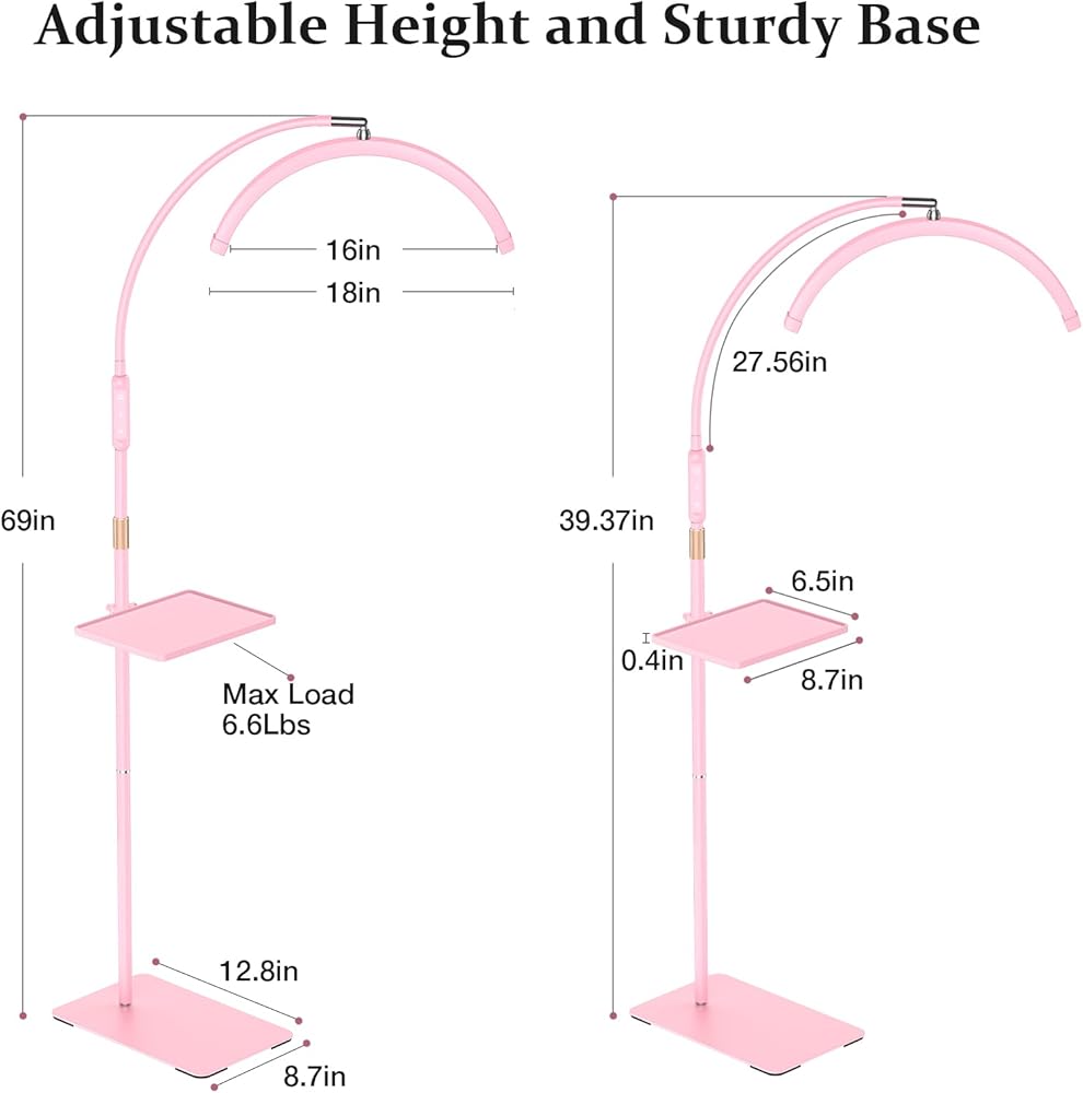 【Adjustable Height and Sturdy Metal Base】 Mznoo lash light can adjust the height from 39.37'' to 59'', offering you with a comfortable height. And the metal base is 12.8'' x 8.7'' ( L x W), wide and heavy-duty enough to stand stably.