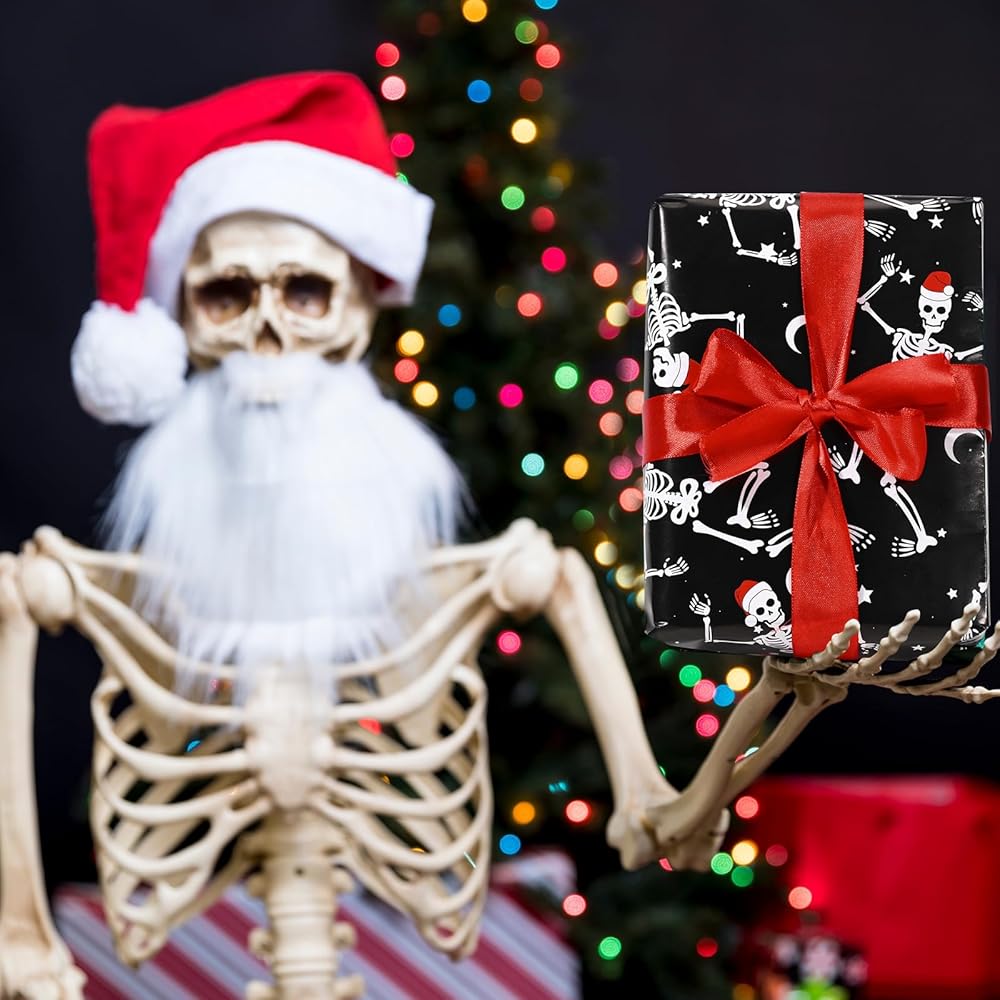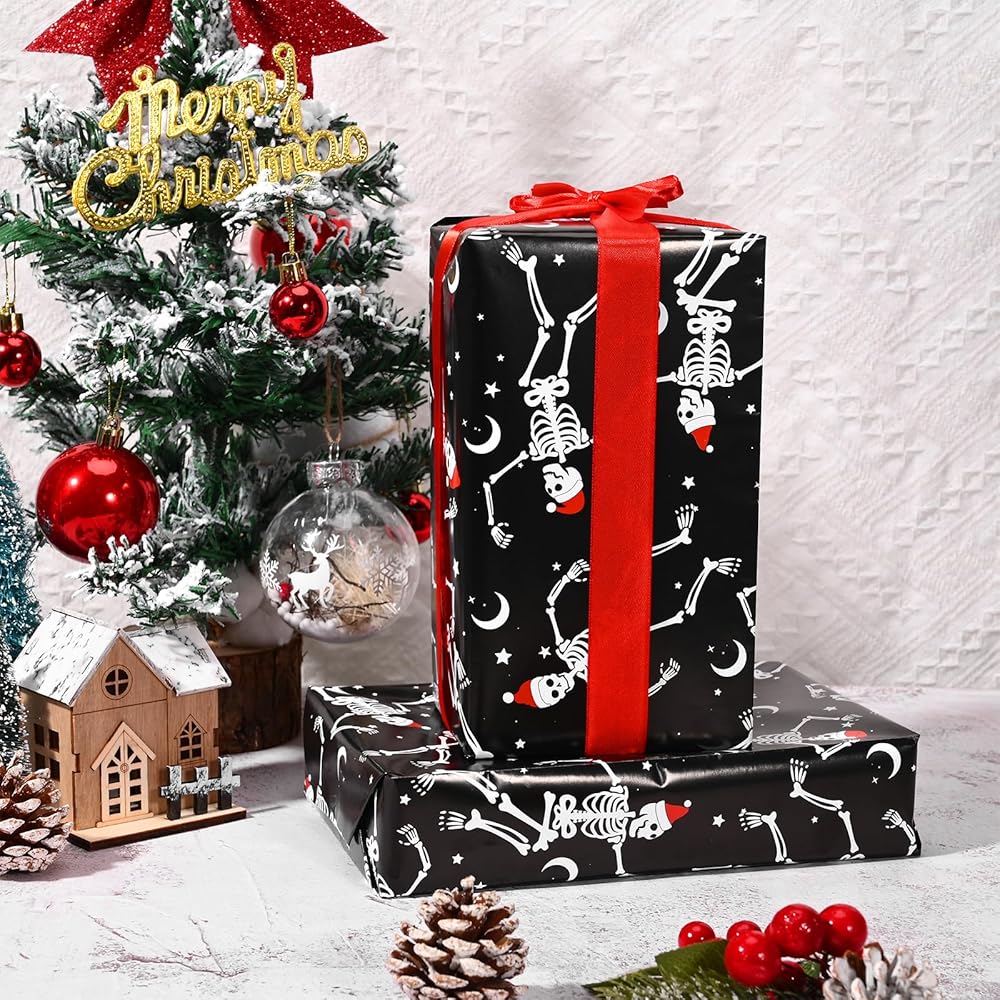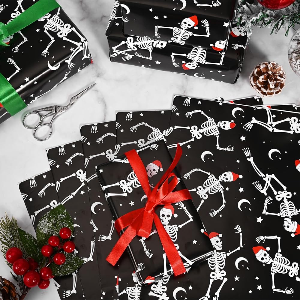 12 Sheets Dancing Skeleton Wrapping Paper Xmas Skull Graphic Gift Wrap Paper for Winter Holidays Xmas Party DIY Crafts Supplies, 19.7X 27.6 inches