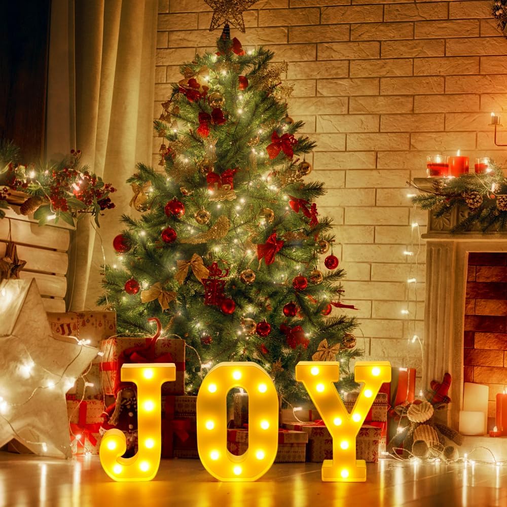 XIMISHOP Christmas Decor-Christmas Decorations Indoor-3 LED Marquee Light Up Letters Sign "JOY" Christmas Lights for Xmas Home Kitchen Fireplace Tabletop Party Decoration