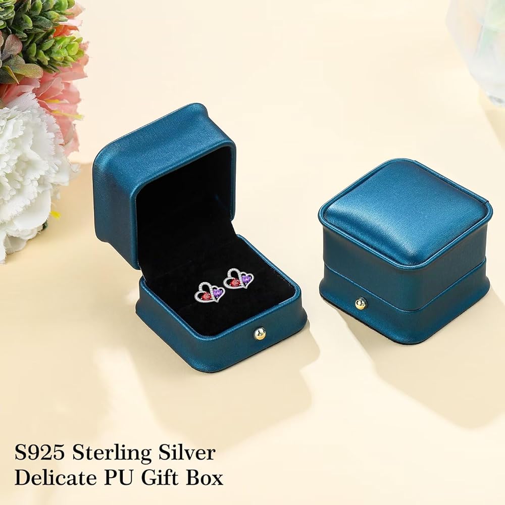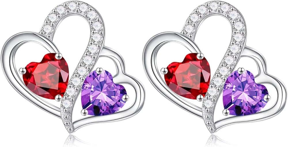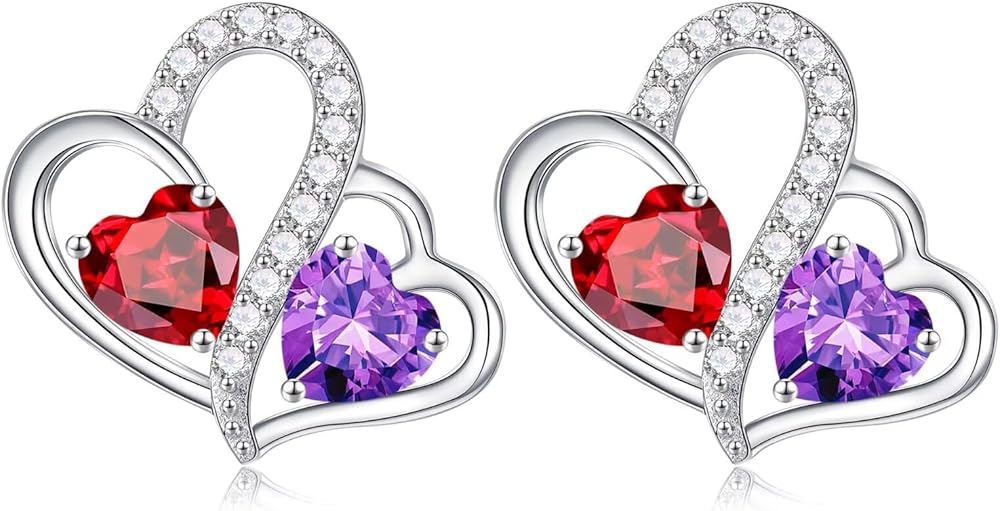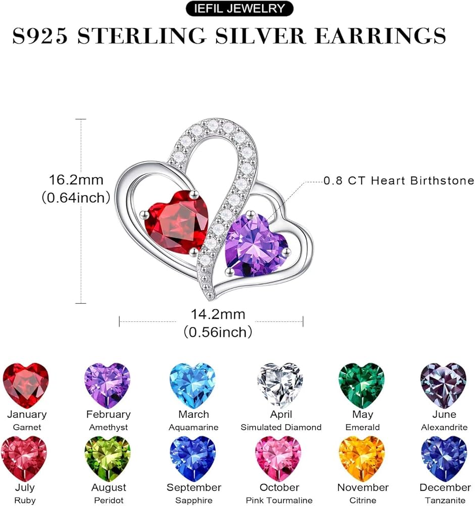 Iefil Valentines Day Gifts for Her - Birthstone Earrings Gift for Women, 925 Sterling Silver Double Heart Birthstone Earrings | Anniversary Birthday Gifts for Women, Personalized Jewelry for Wife Mom