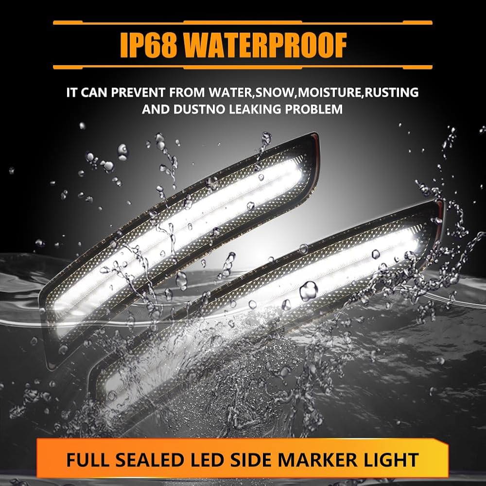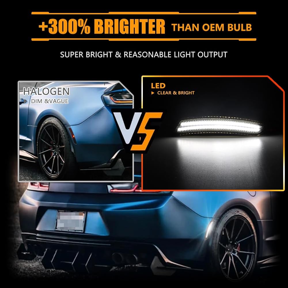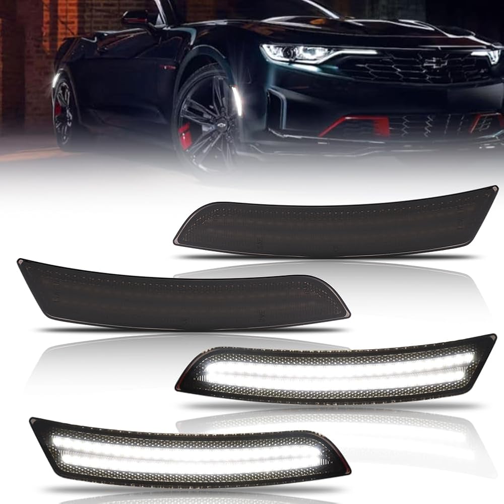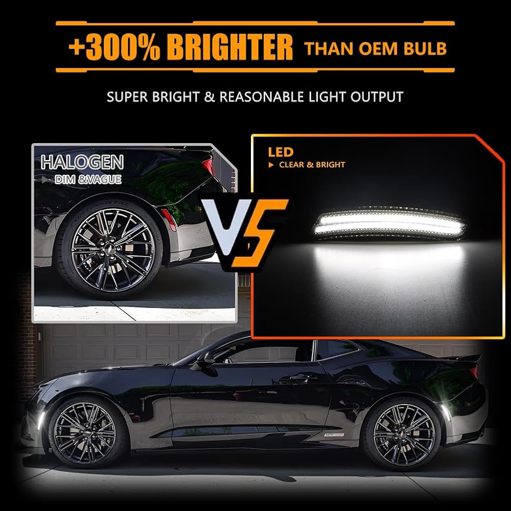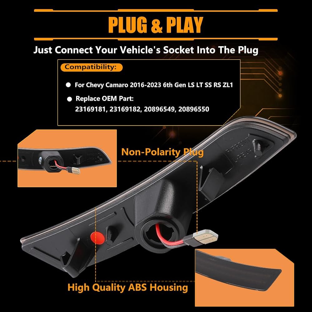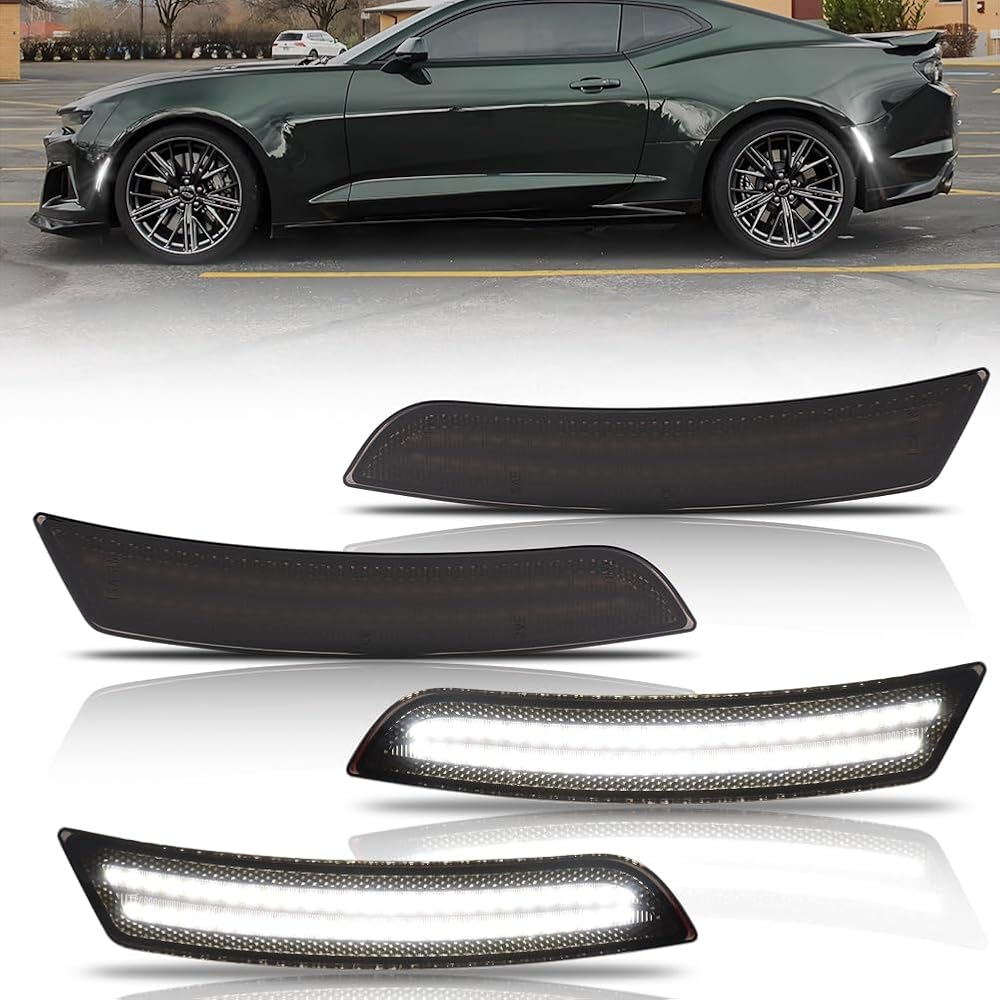 PRECISION FIT: Expertly designed for 2016 2017 2018 2019 2020 2021 Chevy Camaro. This package includes 4 PCS Front & Rear LED side marker lamps, which effortlessly replace OEM parts: #23169181 23169182 20896549 20896550, ensuring a perfect fit without the need for modifications. Verify your vehicle's year and model for a flawless upgrade.