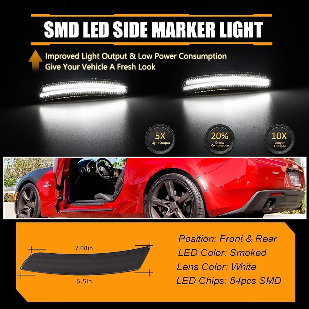 Front & Rear Fender LED Side Marker Lights for 2016-2023 Chevy Camaro, 6th Gen Camaro Smoked Lens Side Bumper Marker Lamps, White LED Side Markers Turn Signal Lights, 4 PCS