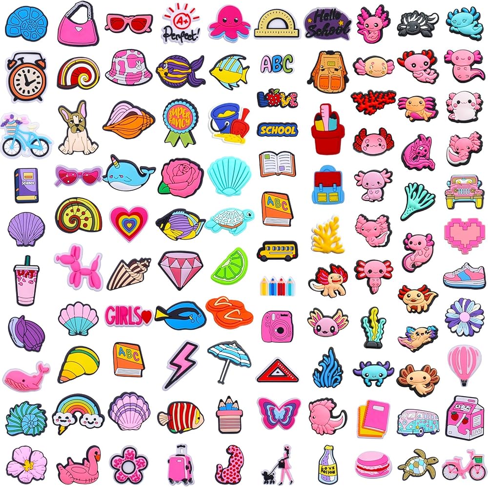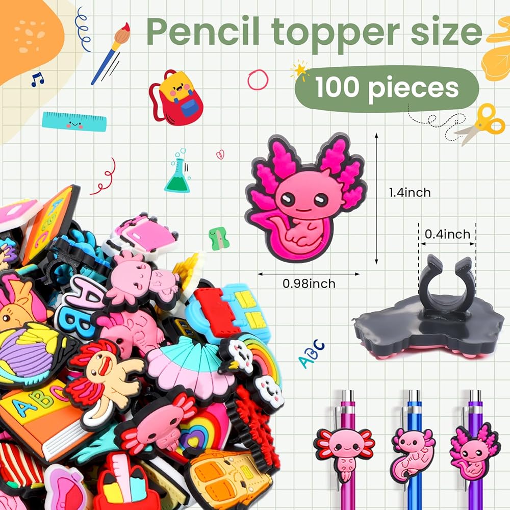 100 Pieces Cute Axolotl Pencil Toppers for Kids, Different Decorative Bulk PVC Animal Fruit Pen Topper Random Cool Pencil Charms Pencil Clips Decorations for School Prize, Classroom Reward, Gift Idea