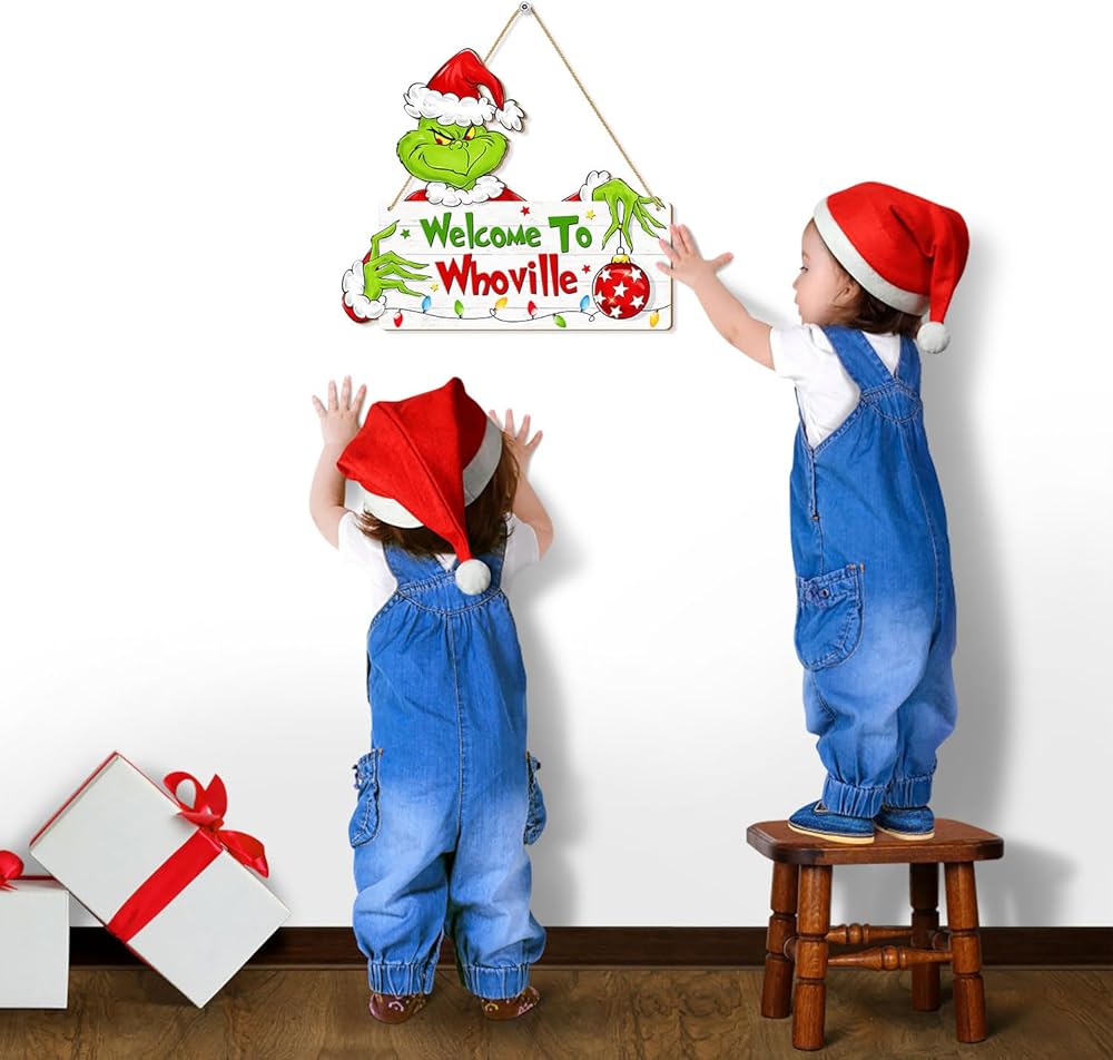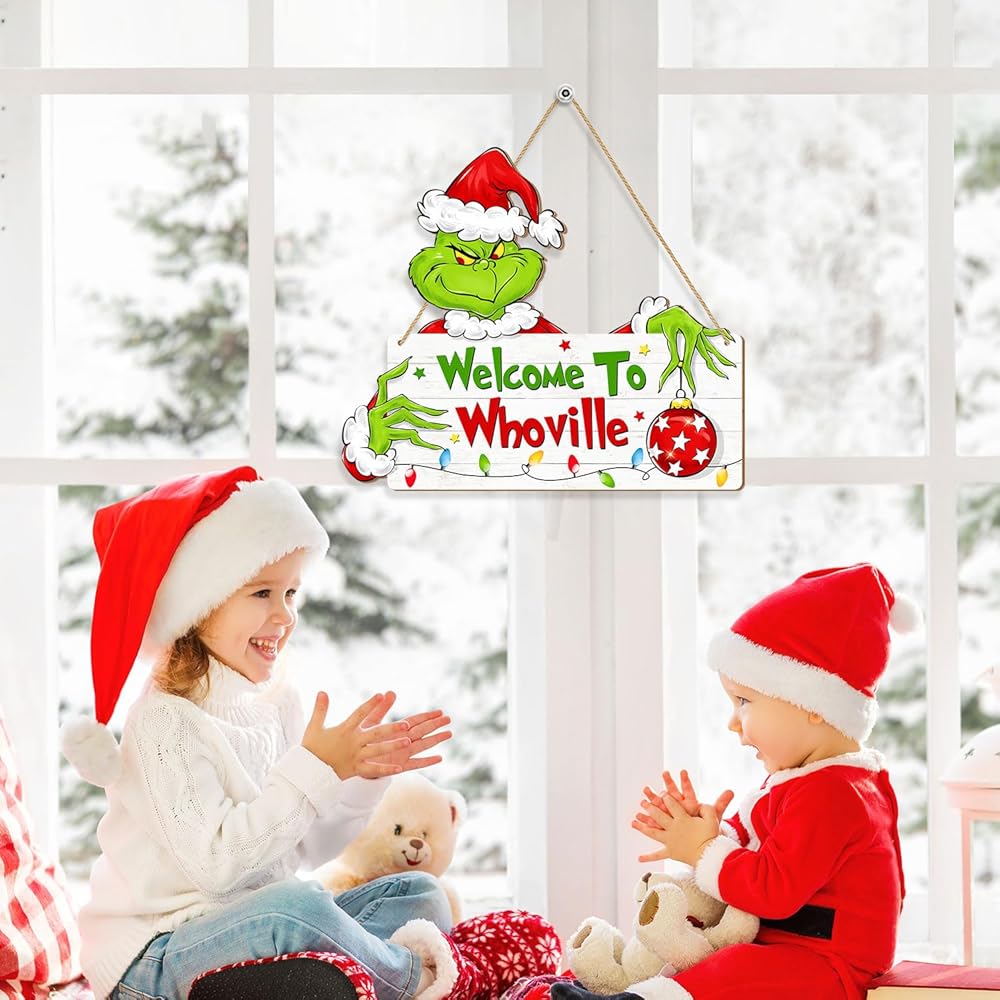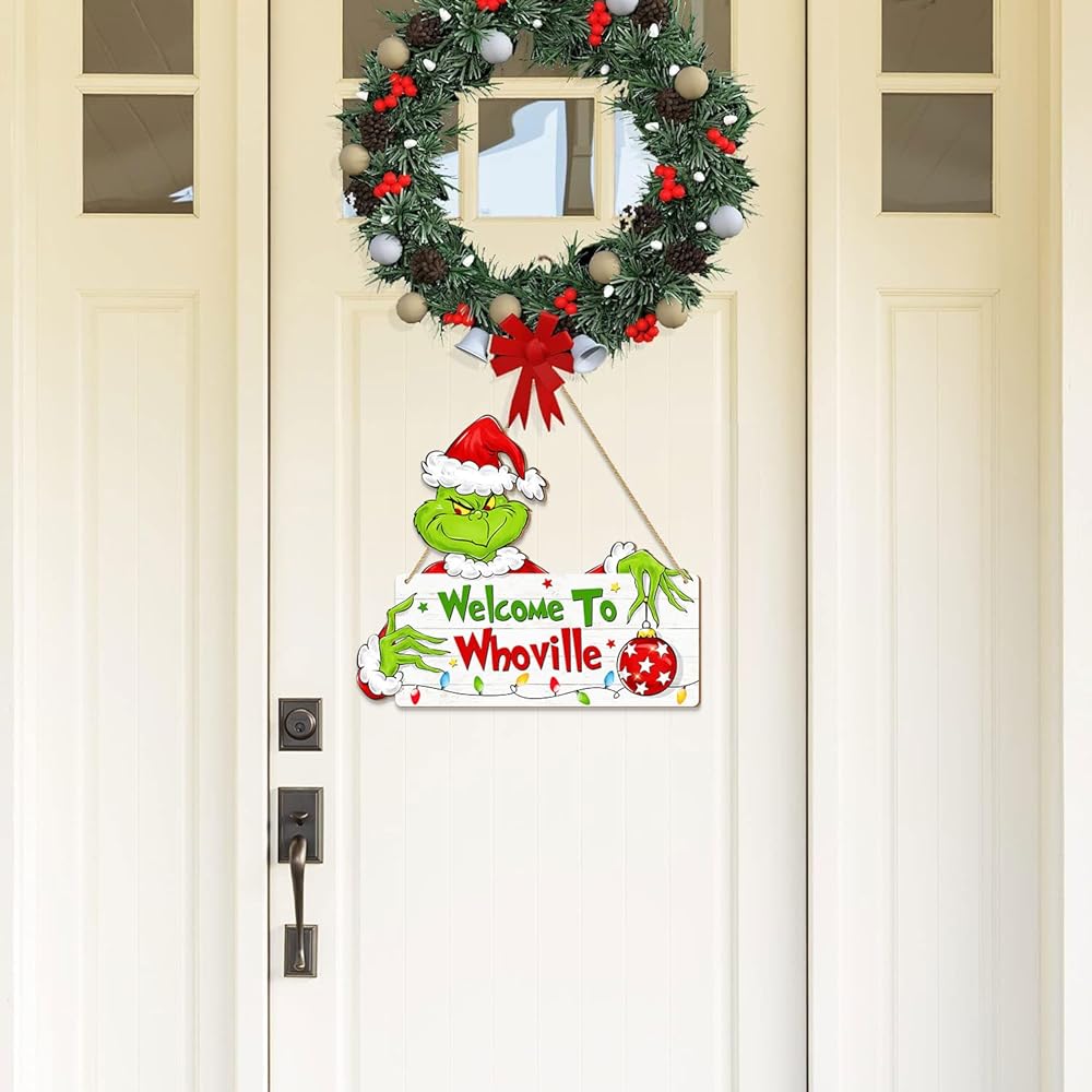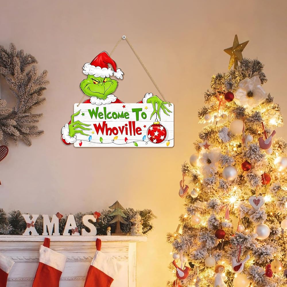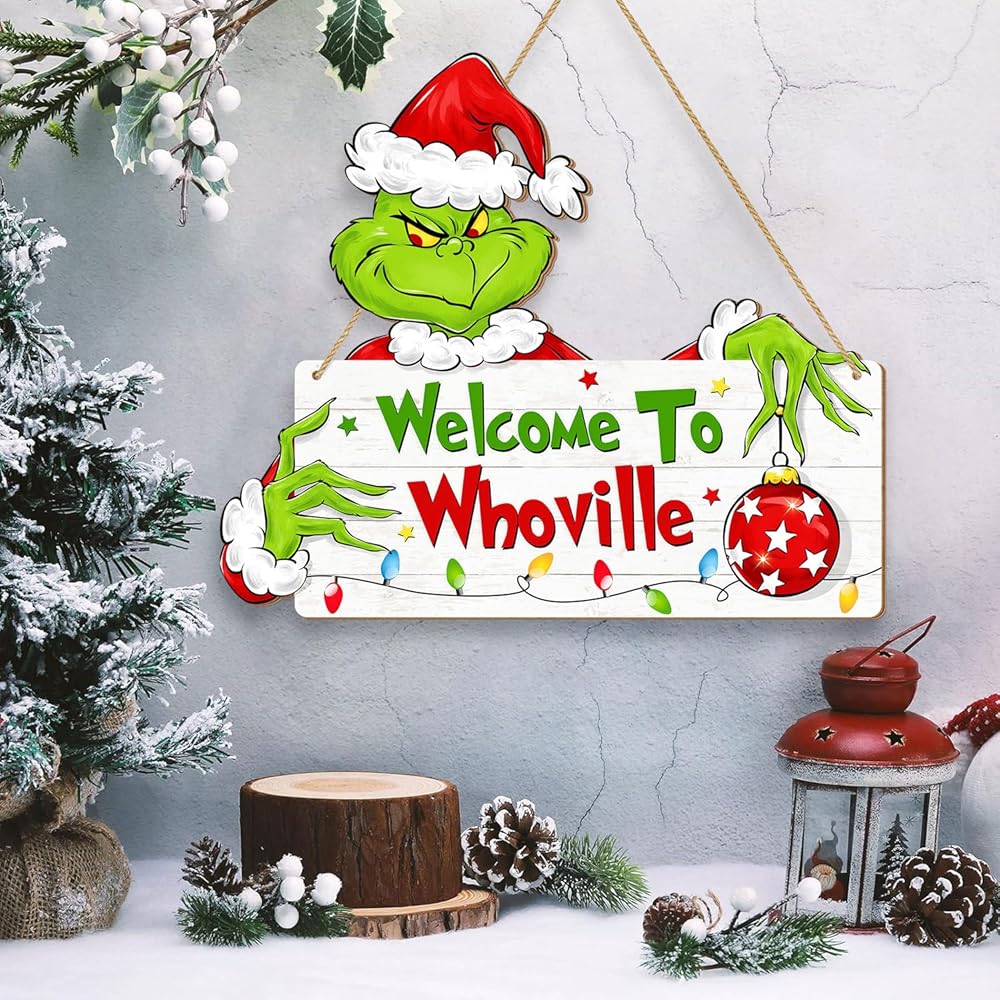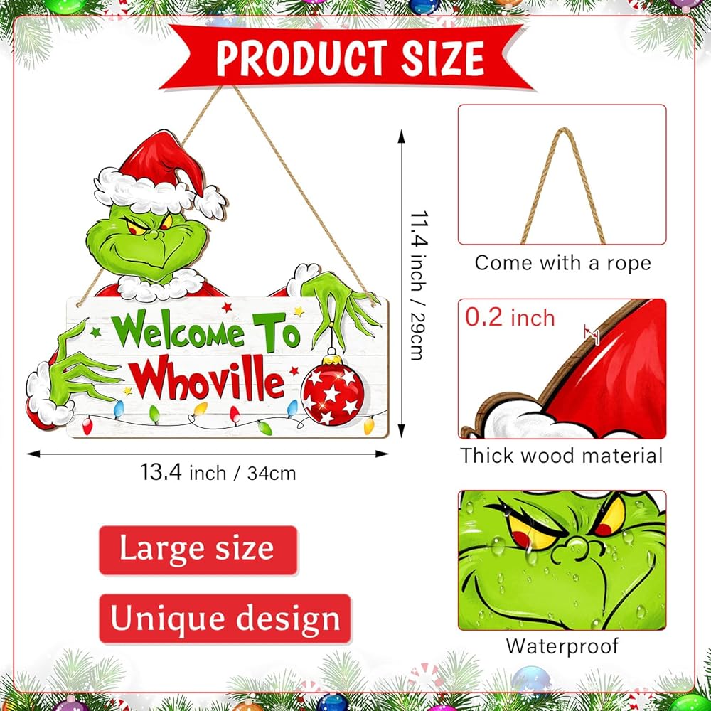 Bring the whimsical world of Whoville to your home this holiday season with this delightful Christmas door sign. Crafted from durable wood, this charming decoration features the a "Welcome to Whoville" sign, complete with a dangling ornament and festive lights. Hang it on your front door or wall to greet guests with a touch of playful cheer.