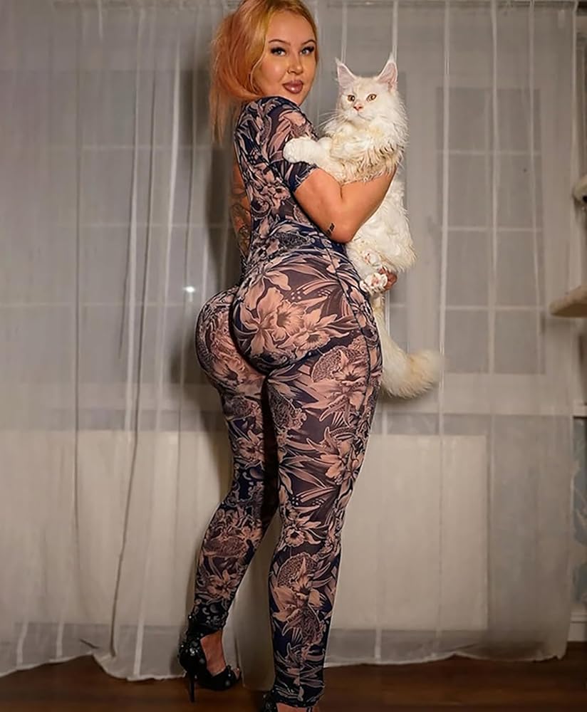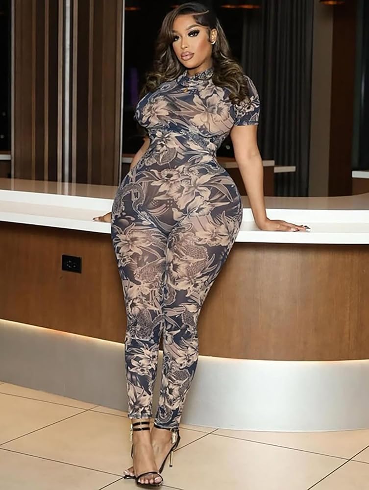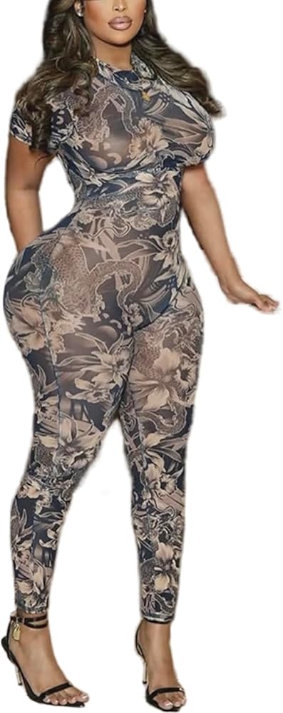 Women Sexy Bodycon Jumpsuit - See Through Mesh One Piece Party Club Outfit Summer Print Body Suit Backless Skinny Pantsuit