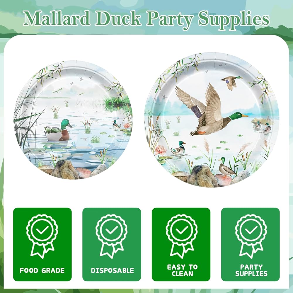 171pcs Mallard Duck Party Supplies Mallard Duck Party Plates Napkins Tableware Set Disposable Paper Cups Green Forks Tablecloth and Banner Duck Hunting Birthday Party Decorations Serves 24