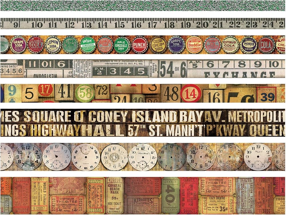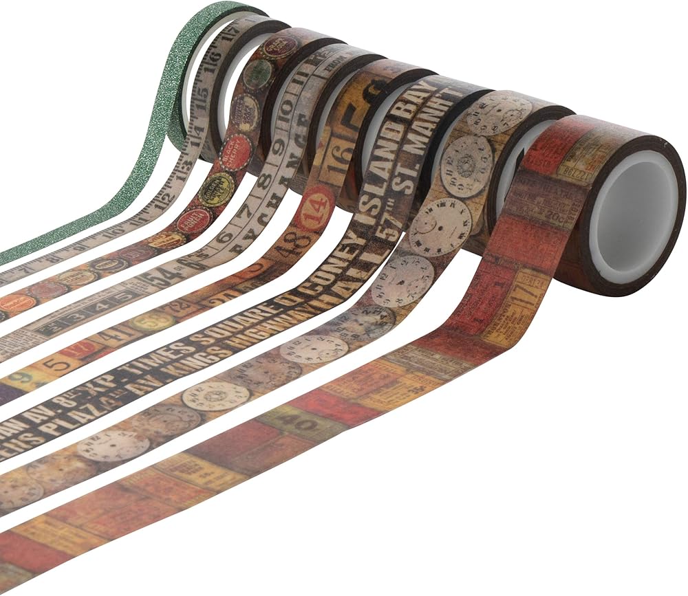 The perfect addition to scrapbook pages, cards and more! This package contains one 2 yard tape roll and seven 6 yard tape rolls in assorted designs. Imported.