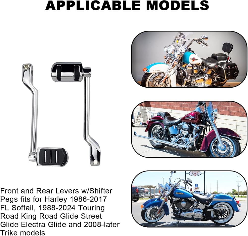 Compatibility:Heel/Toe Shifter Levers w/Shift pegs, Front and Rear Shifter Pegs for Harley Davidson 1986-2017 FL Softail, 1988-2023 Touring Road King Road Glide Street Glide Electra Glide and 2008-2023 Trike models.
