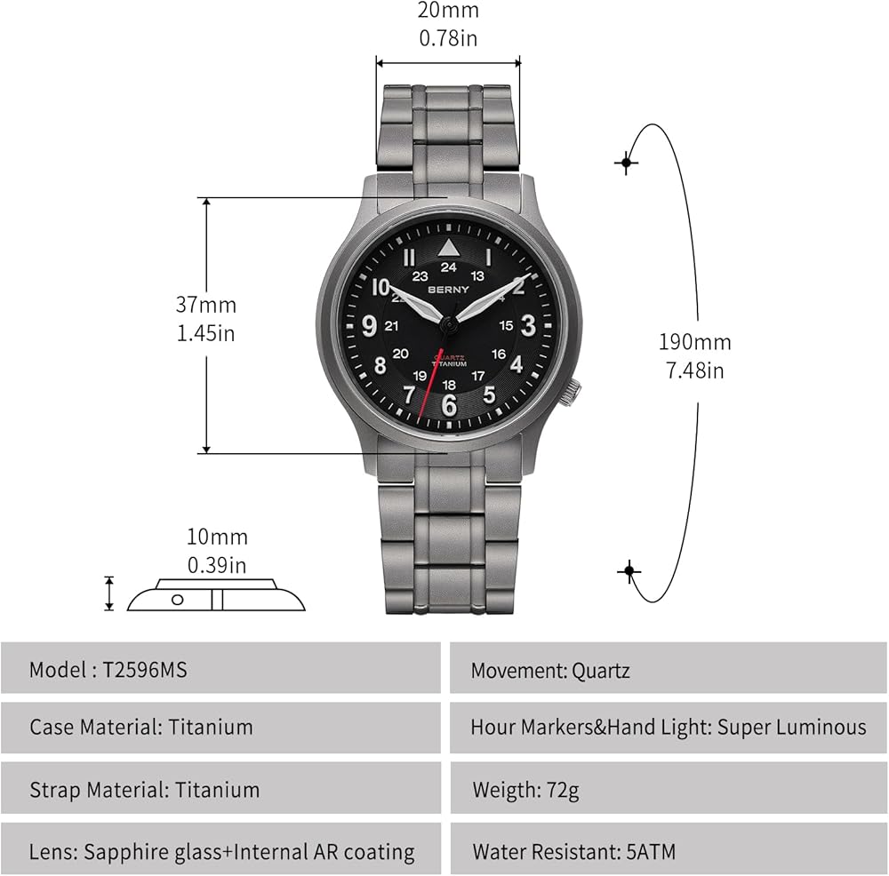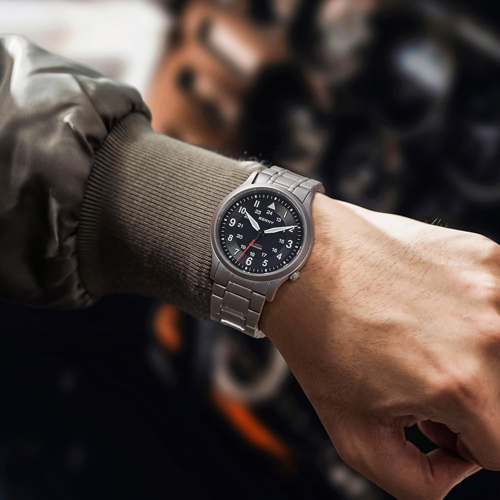 BERNY Titanium Watches for Men, Men's Field Wrist Watch 5ATM Waterproof, Luminous Military Wristwatch for Men and Women, Unisex Analog Sport Watch, Japanese Sweep Second Quartz Movement