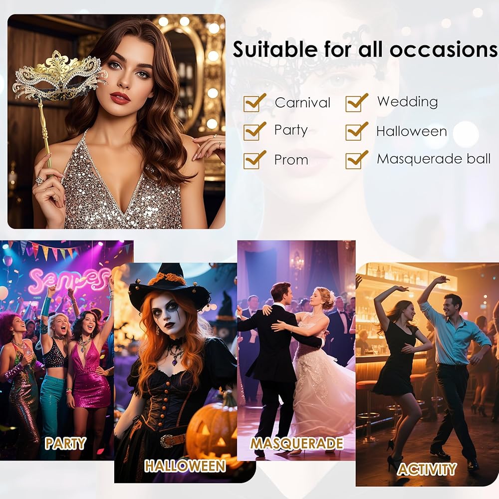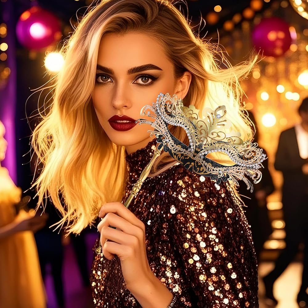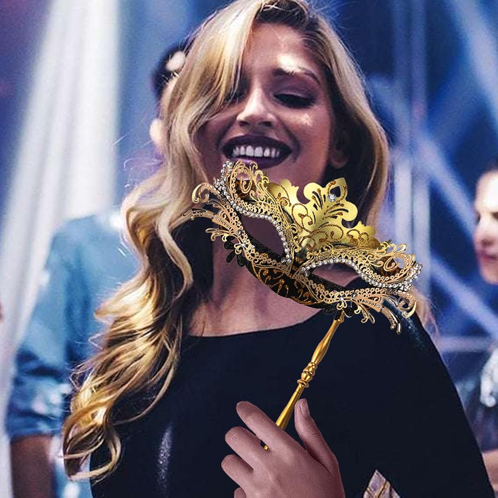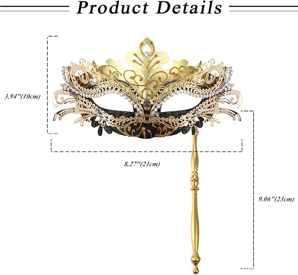 ☀ Features: Mask decorated with gold powder and rhinestones, hollow iron shape, with hand-held stick