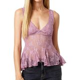 This cute cami in allover lace with a semi-sheer bodice. Cropped above the waist in a babydoll silhouette with a plunging neckline, an empire waist and a pointed hemline. Complete with adjustable ties and a cutout at the back.