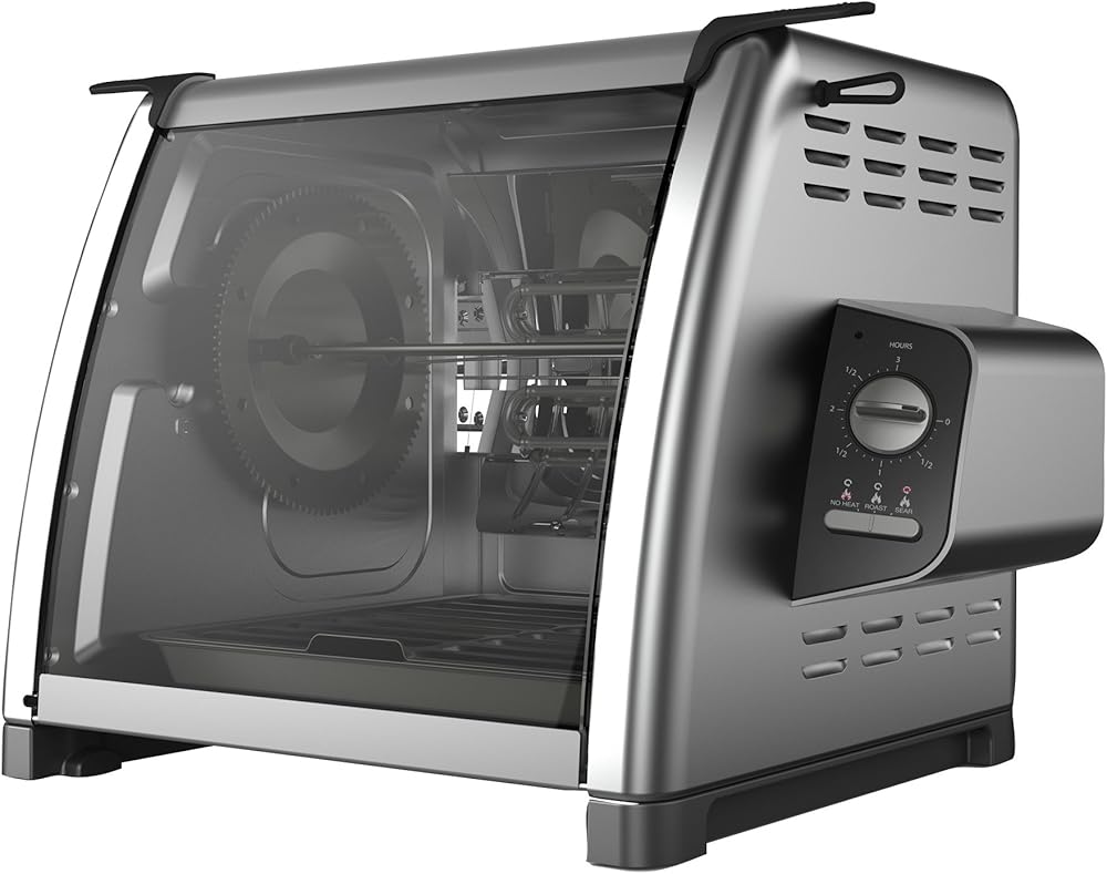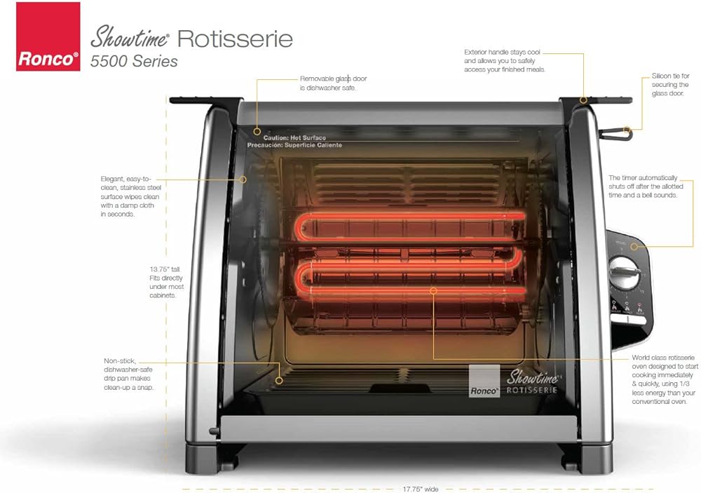 The sleek and stylish 5500 Showtime Rotisserie is a modern version of the Showtime classic. A curved glass front allows you to see all your foods rotating at the precise speed to achieve optimal cooking results. Continual rotisserie basting results in uniformly browned and crisped food on the outside, while keeping all the moisture and flavor on the inside. As it rotates, the excess fat and grease drip down into the removable drip pan below. All removable parts are dishwasher safe, so cleanup has never been easier.