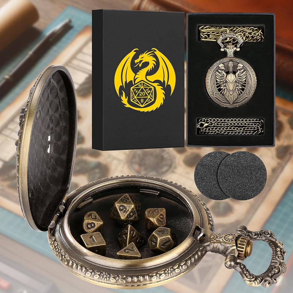 VERSATILE DICE: The pocket watch case's hidden compartments blend seamlessly into the design, providing plenty of space to store your cherished multi-sided dice set, as well as a vintage pendant accessory