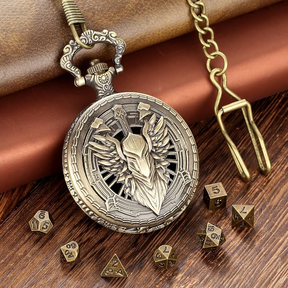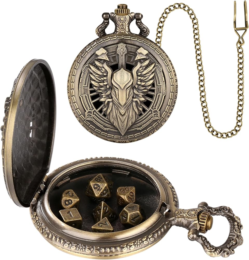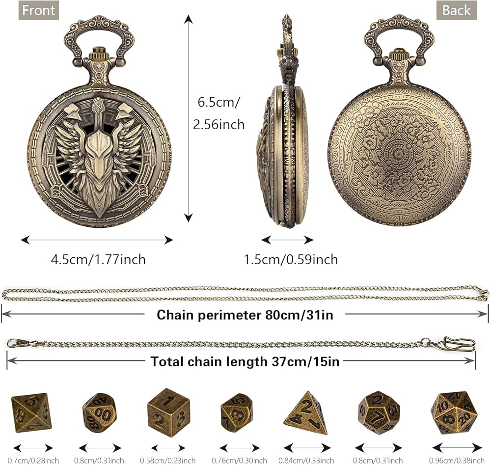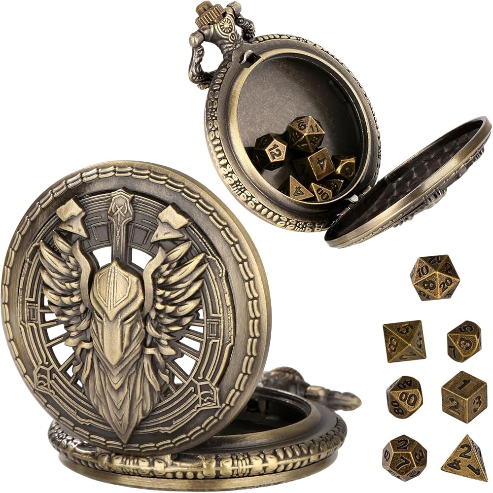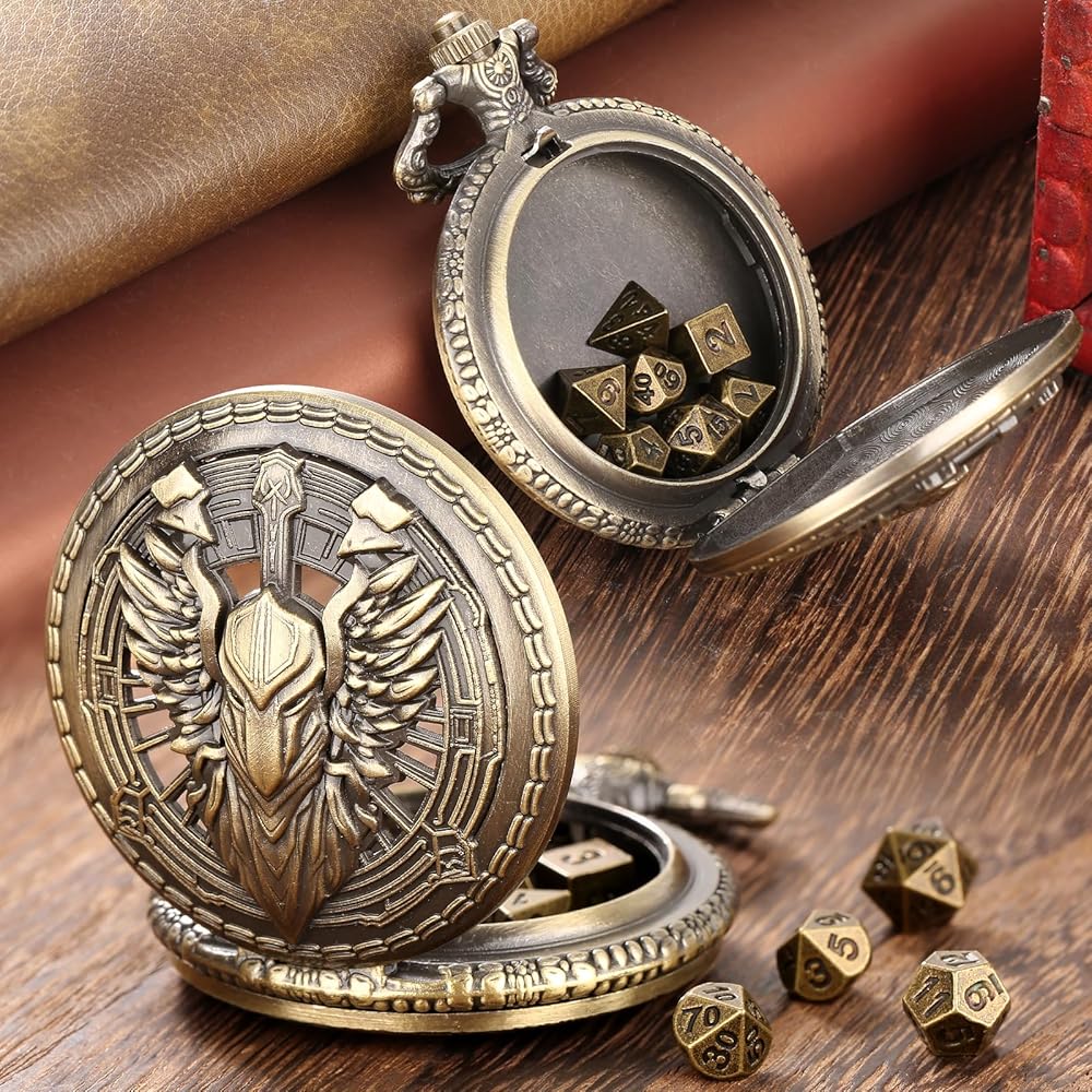 Mini DND Dice Set Steampunk Hollow Paladin Knight Warrior Pocket Watch Shell Case, 7pcs Polyhedral Metal D&D Dice Set with Gift Box, Role Playing Board Games Accessories