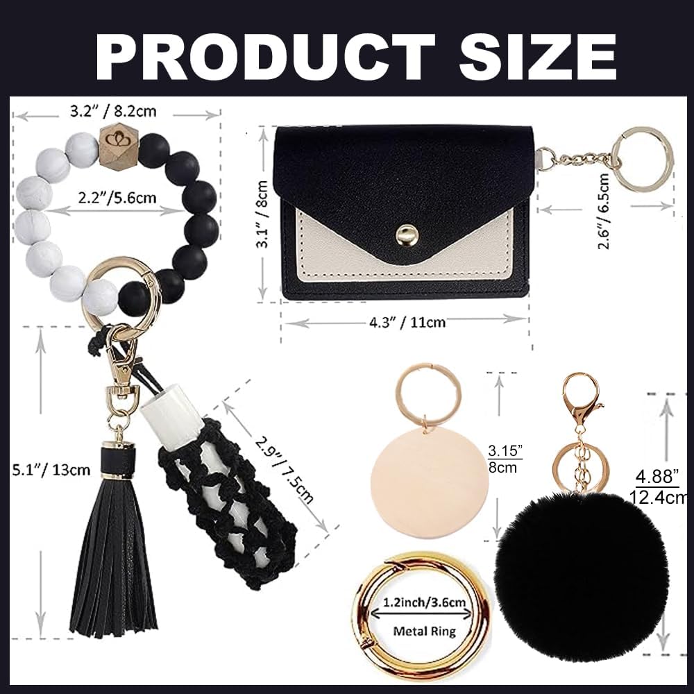 keychain Wristlet for Women: Cute keychains equipped with 7 PCS items: includes 1x silicone key ring wristlet, 1x hand-knitted net lipstick holder,1x PU leather cards holder wallet,1x PU leather tassel,1x pom pom ball, 1x DIY wood tags, 1x Metal lobster button. Great gift for women girls on graduation, birthday, mother's day, Christmas, Valentine's day, wedding anniversary