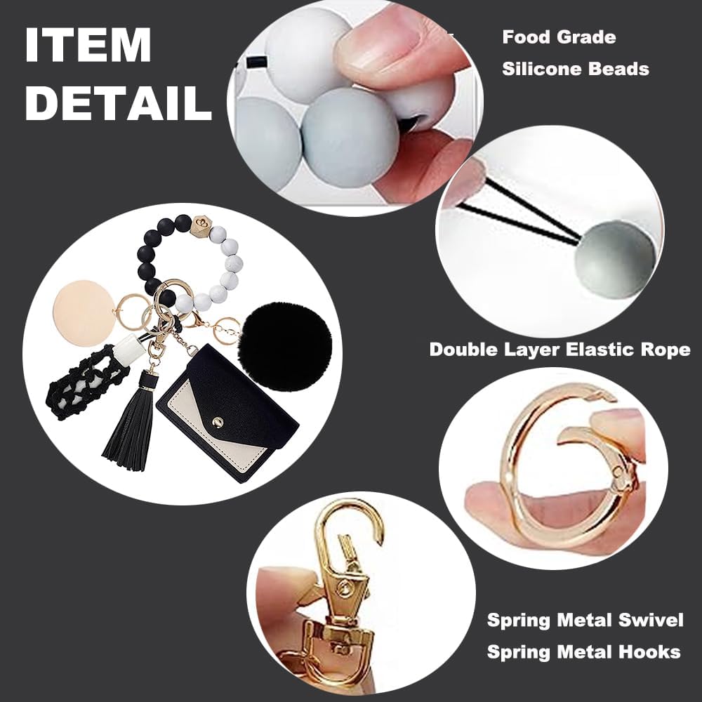 Convenient Keychain Wristlet: Silicone bead bracelet keychain are made of BPA-free and food grade silicone, a wooden bead. connected by elastic and durable double-layer elastic ropes.fits most women's wrists and and easily slide on your hand. The silicone bead keyring is more cute and practical than bracelets, but it will not slide down as easily as bracelets.