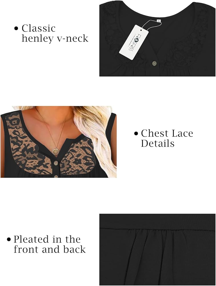 Plus size tank tops for women feature henley v-neck tank tops with lace and pleated in front and loose fit, shirttail hem. It's suitable for any body shape.