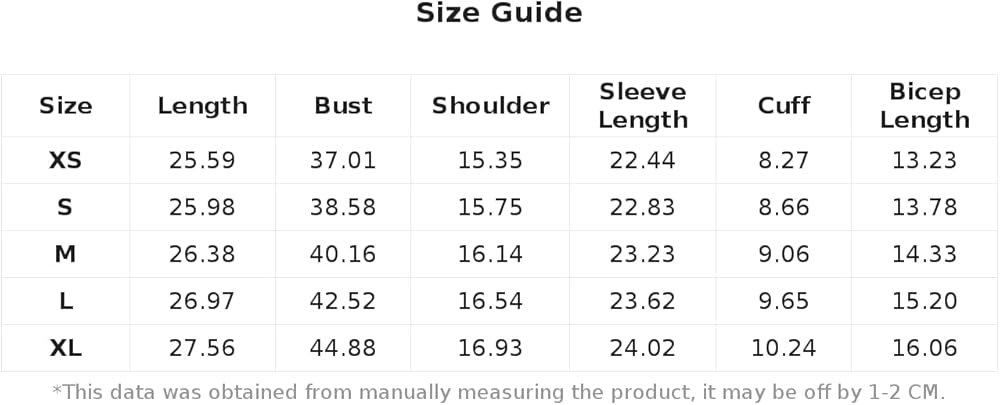 XL:Bicep Length:16.1IN,Bust:44.9IN,Cuff:10.2IN,Length:27.6IN,Shoulder:16.9IN,Sleeve Length:24.0IN