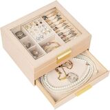 【3 LAYERS with 2 Drawers】 Dimension:9”x8”x5.3”. The top layer is a ring layer With removable earring board and 8 equal size slots,Drawer 1 have 4 long equal size slots and big slots,Drawer 2 is a large slot. So that you can keep your jewelry and or other small accessories flexibly