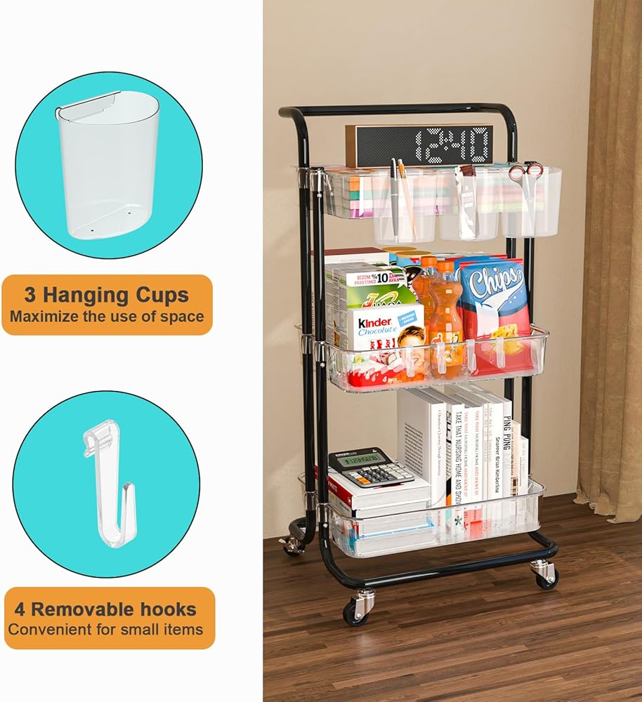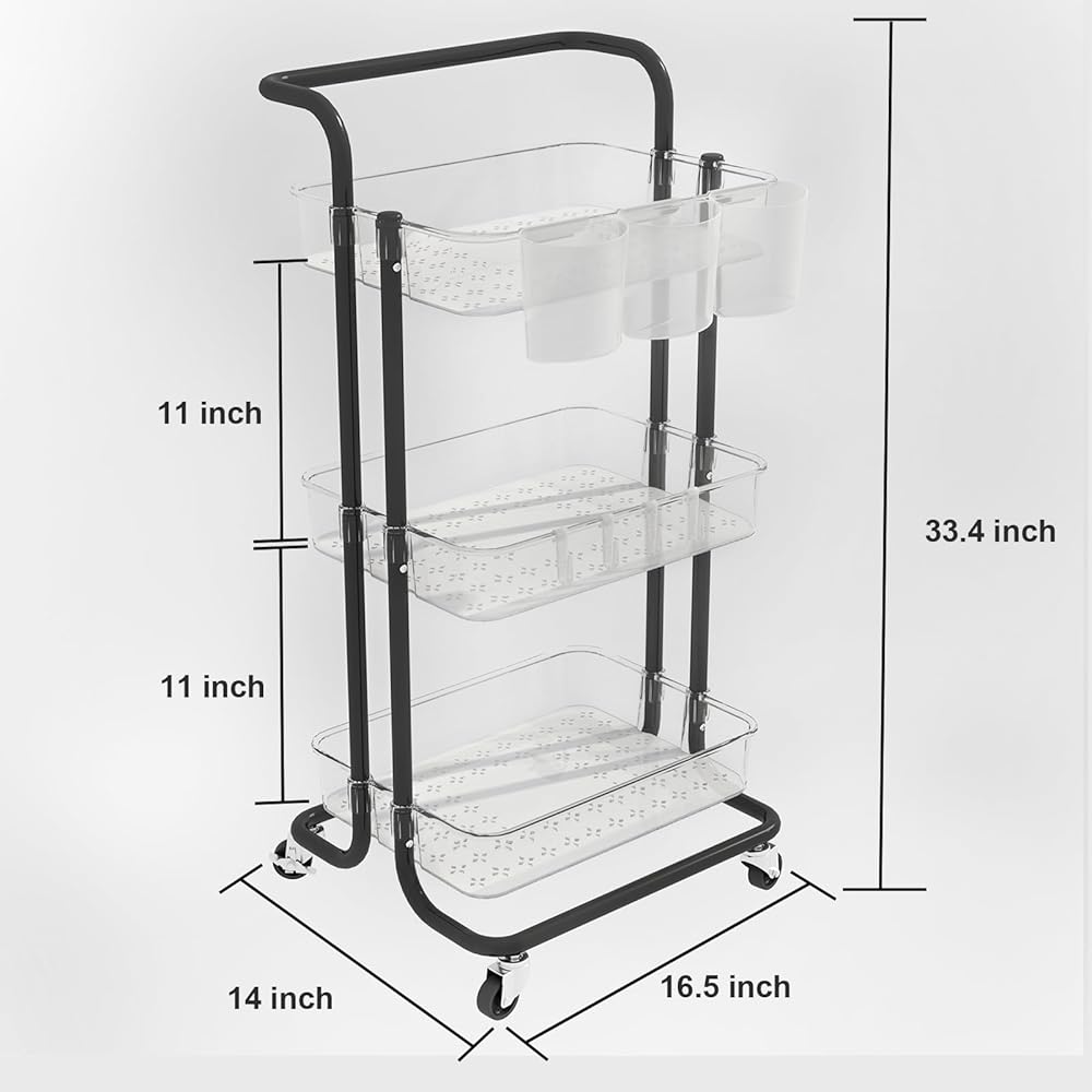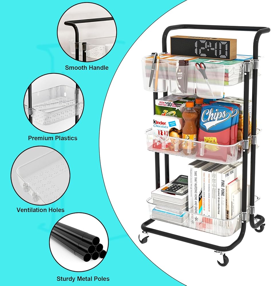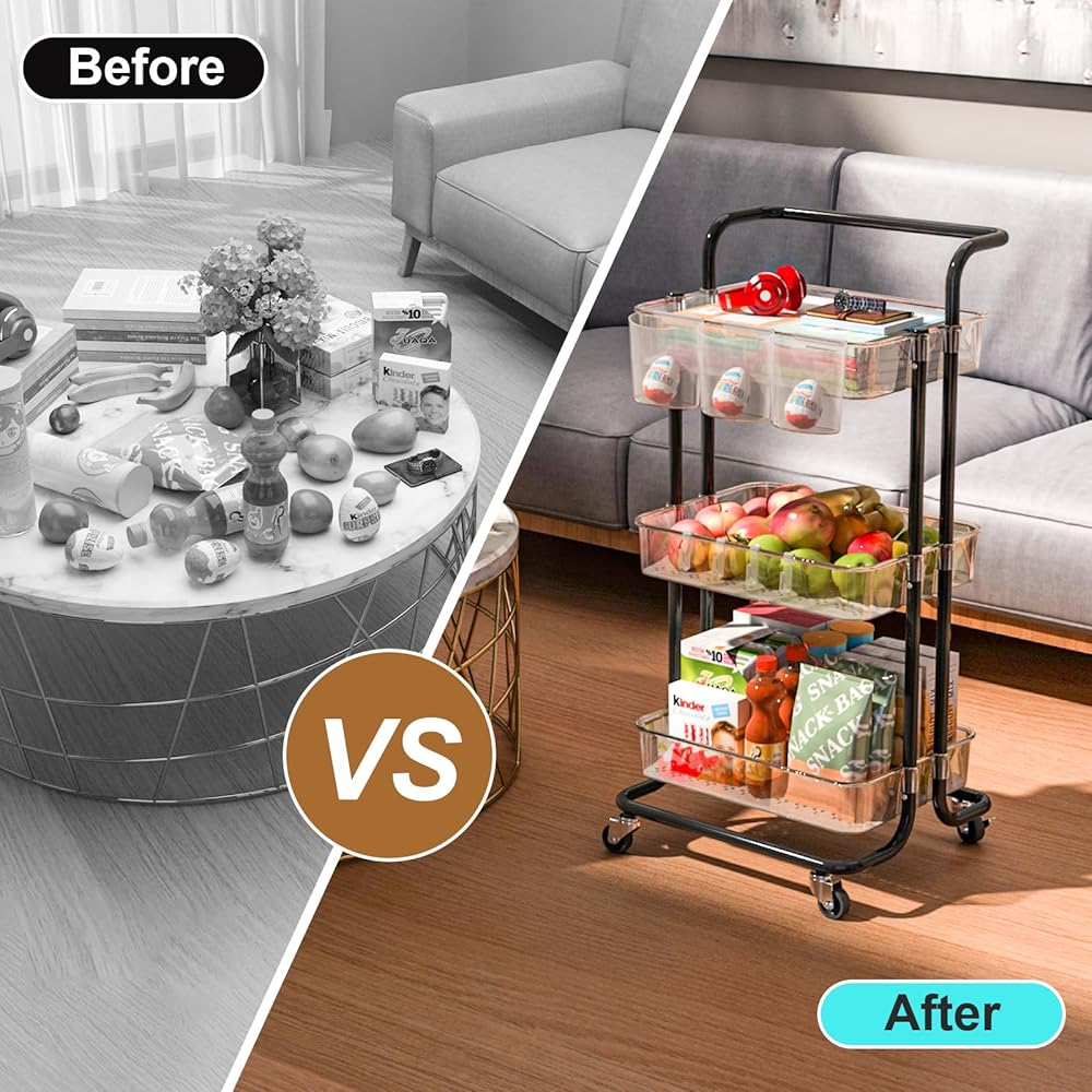 Multifunctional Storage Cart:This 3-tiered utility organizer is exquisite and keep all your messy items in order and save a lot of space in your house. Perfect for organizing cosmetics, snacks, books, office supplies, cleaning supplies and other items.