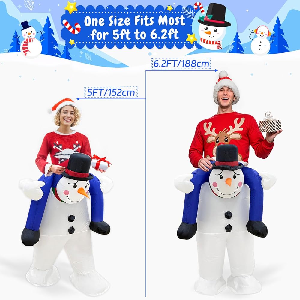 【Funny Inflatable Snowman Costume】The inflatable Christmas costume is a show-stopping ride-on outfit that will bring everyone a smile at the Christmas party. With its whimsical design featuring a hilarious snowman and an orange carrot nose, this inflatable costume creates the delightful illusion that the wearer is being joyfully carried by a cheerful snowman. It's the perfect way to spread festive cheer and ensure you're the center of attention this Christmas season!