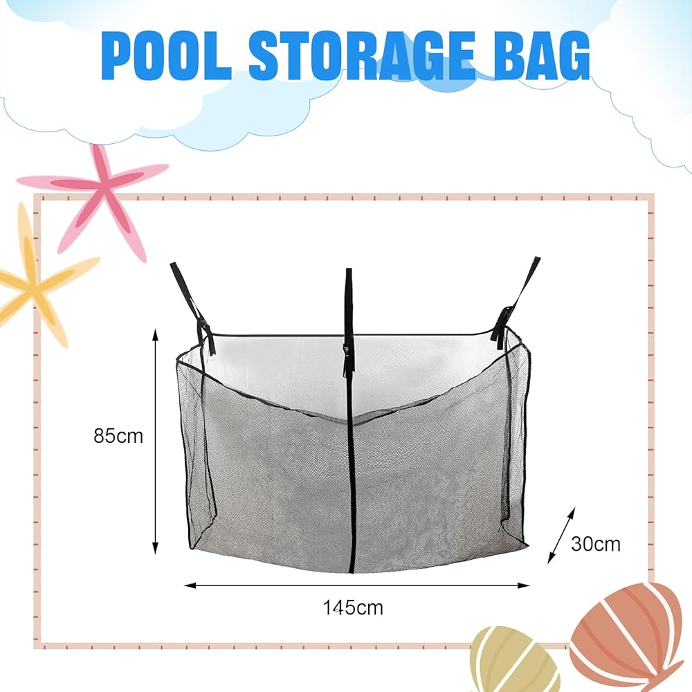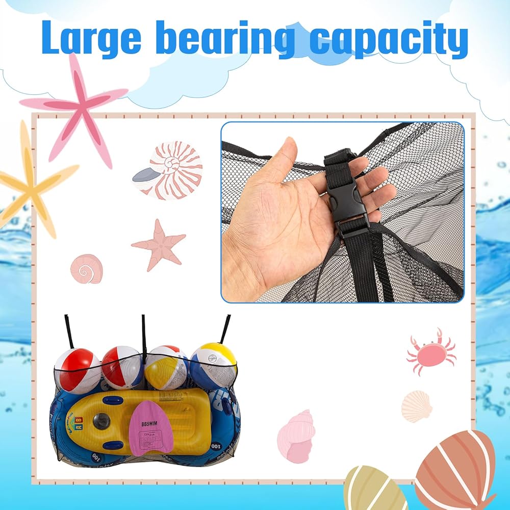 Pool Accessories:The hanging Pool Storage mesh bag allows inflatable toys to better shed sand and water, and can withstand wind and rain disturbances, keeping items from blowing away,and the mesh allows easy rinsing and quick drying of pool toys, sports accessories and cleaning equipment
