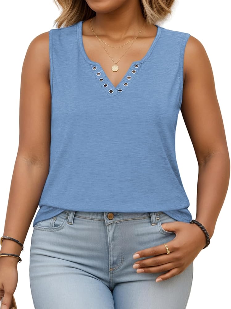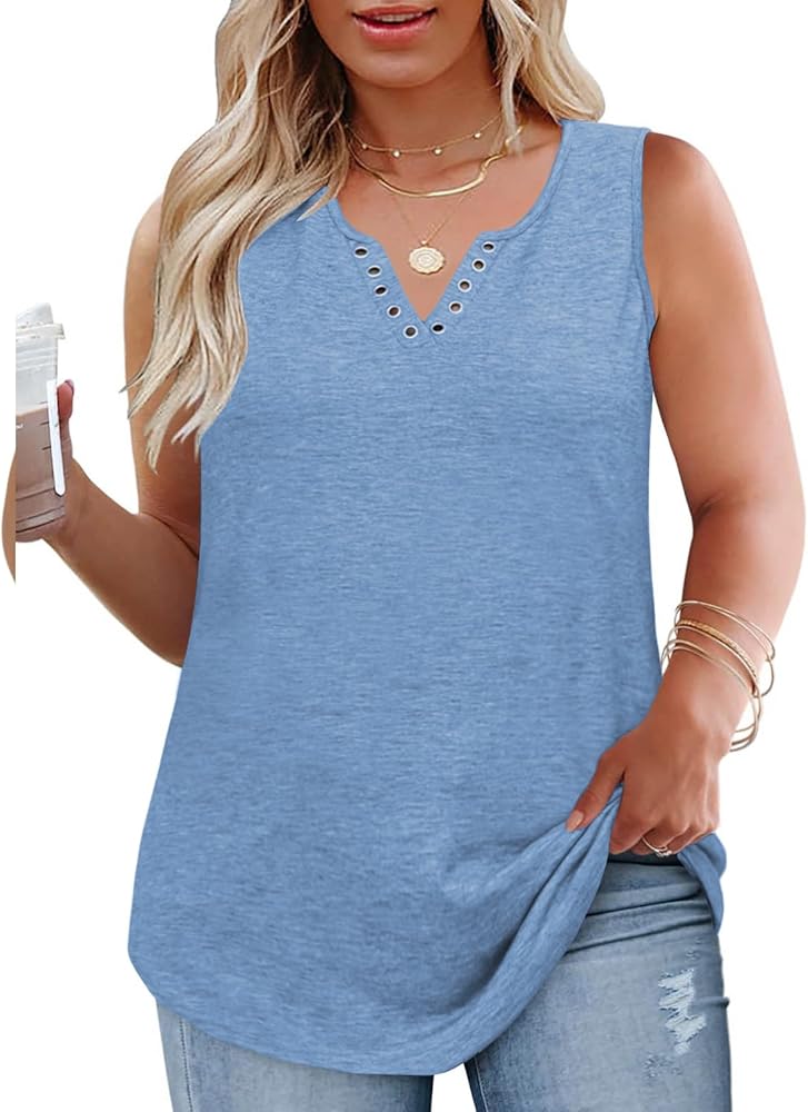 3X tank tops for women plus size feature chic V-neck with a unique ring-hole detail and cool, cozy sleeveless design, creating trendy, casual visual impact with cute and feminine look.