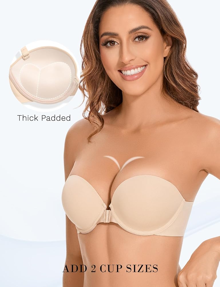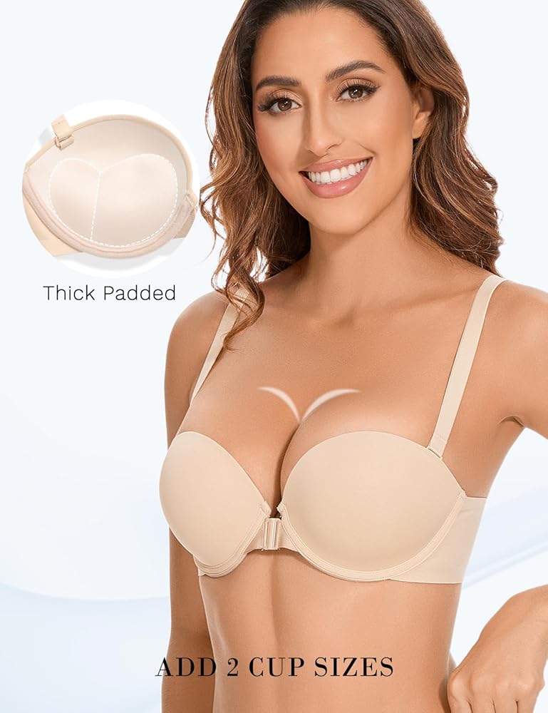 Our Upushall Push Up Padded Bra--This bra has quite a bit of padding that adds just the right amount of lift, enhancing my shape perfectly. It can naturally fill out breasts and not left with gaping around the top. Thick padded bras for women with underwire provide extra support, lift up your chest and enhance your cleavage. In addition, its front buckle and crisscross back design for easy to use and a flattering look under low back or backless outfit.