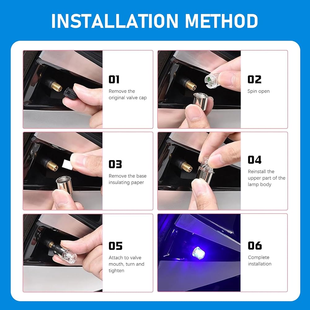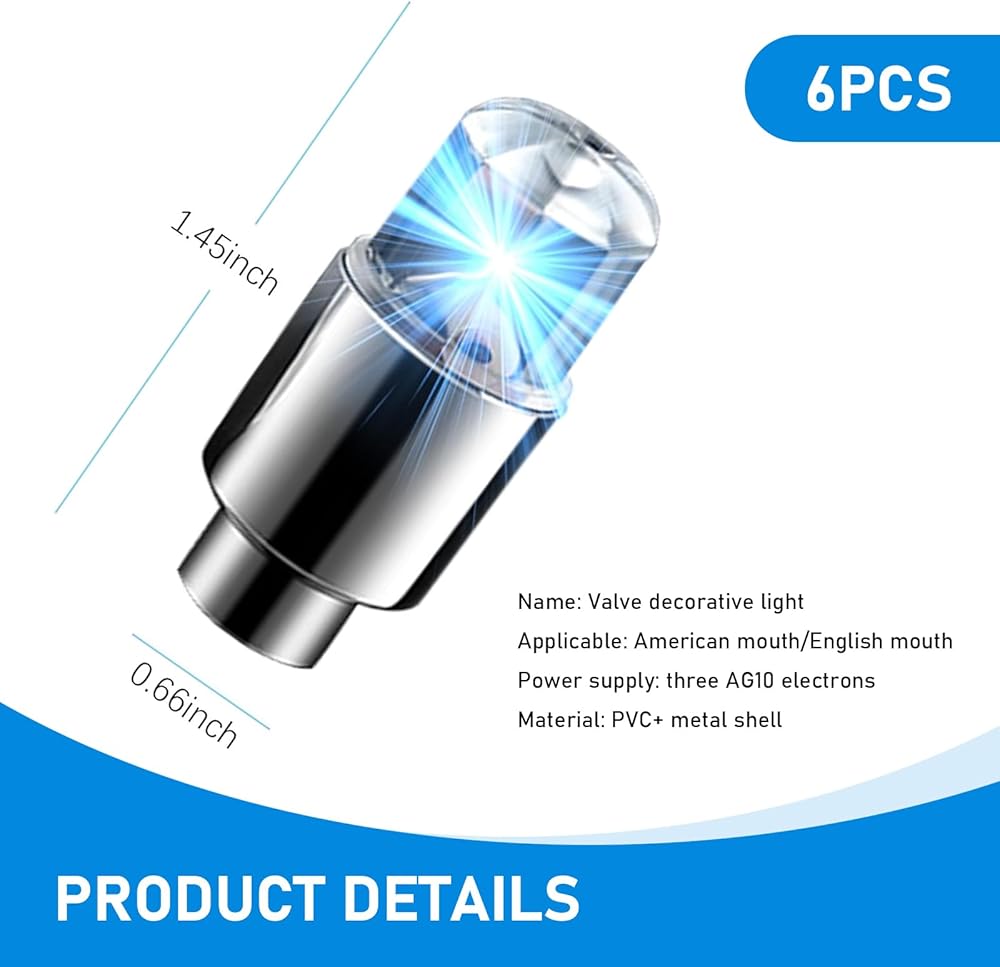Universal Accessories: Package includes 6 x valve cover lights to meet your usage needs. Suitable for most cars, motorcycles, bicycles, scooters, etc. Suitable for American valves and British valves. To use, just unscrew the lamp and detach the insulation piece in the middle. Then screw it onto the tire valve stem and tighten.