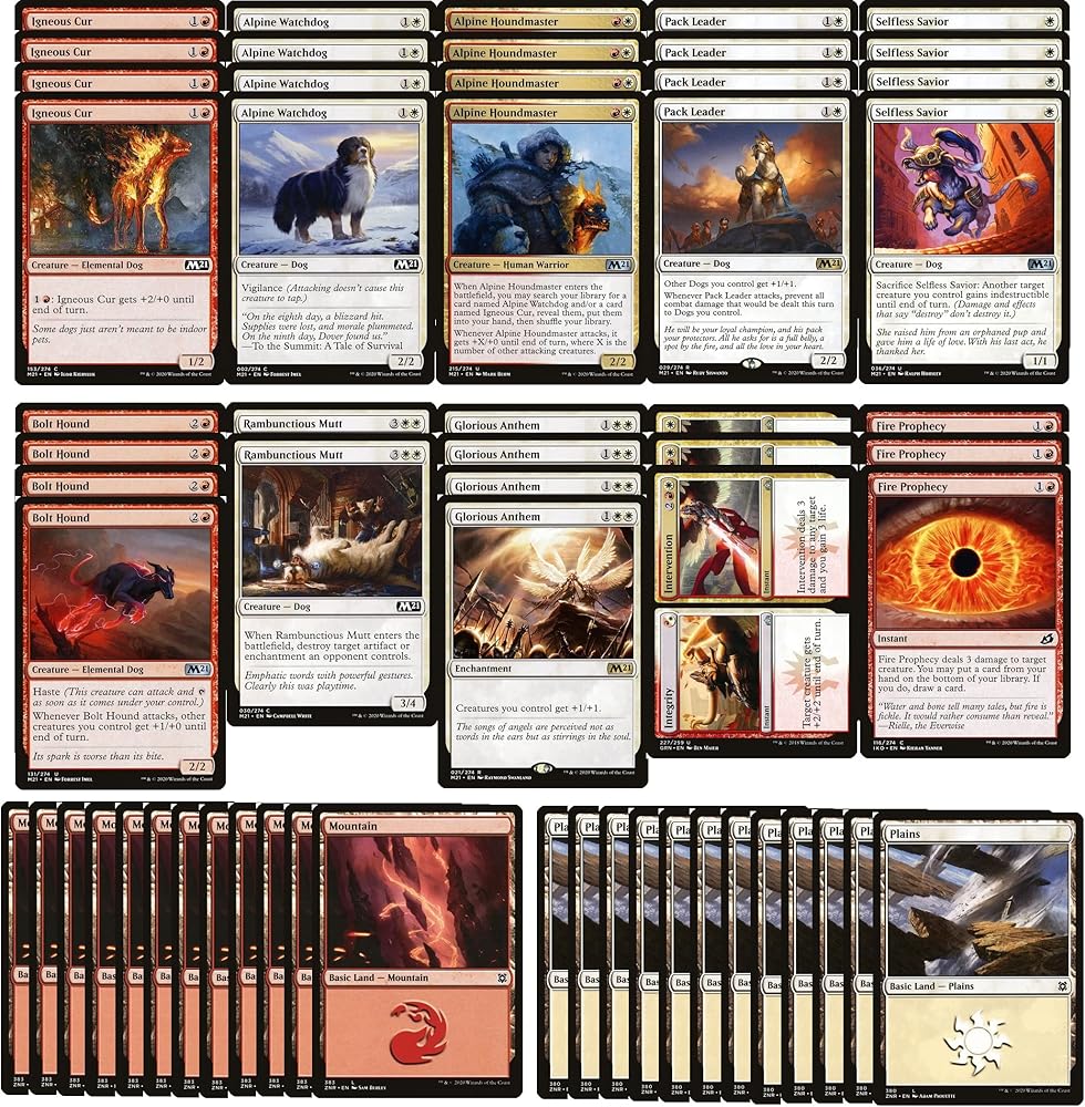 This is a 60 card, boros (red/white) dogs deck. This is a powerful deck that features the new and highly-anticipated dog creature type! The deck features a number of fast, aggressive creatures, combined with 8 anthem effects to quickly attack with a massive army of dogs. The deck features 4 copies of Pack leader, one of the strongest tribal creatures ever printed by Wizards. Not only does Pack leader give your entire dog army +1/+1, but also makes your army immune to combat damage. This is combined with 4 copies of Alpine Houndmaster to help fill your hand with dog creatures, and 18 additional aggressive dog creature cards. In addition, the deck features 4 copies of Glorious Anthem to pump up your entire team, 3 copies of Fire Prophecy for removal, and 3 copies of Integrity // Intervention as an additional combat trick/removal spell. This deck is PERFECT for anyone looking to play a fun, new, themed deck. This deck is remarkably powerful and features a number of powerful creatures and synergies. This deck has been play tested and is remarkably strong, not to mention a ton of fun to play!