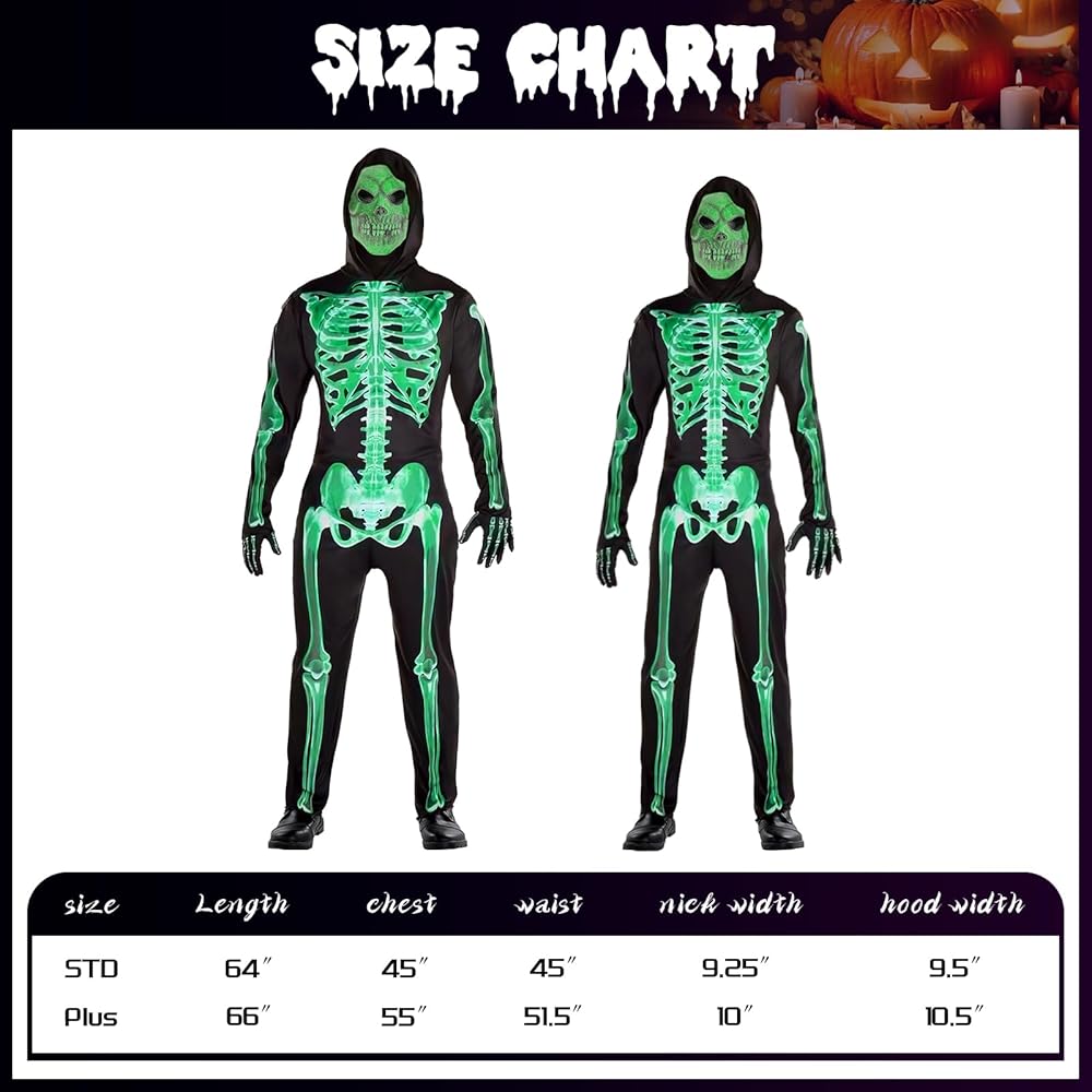 Package Includes: Adult skeleton costume comes with 1 black & green skeleton jumpsuit with hood, 1 face mask, and 1 pair of gloves. Transform into a spooky and stylish skeleton with this adult Halloween costume.