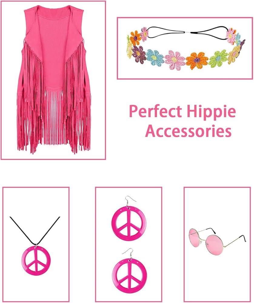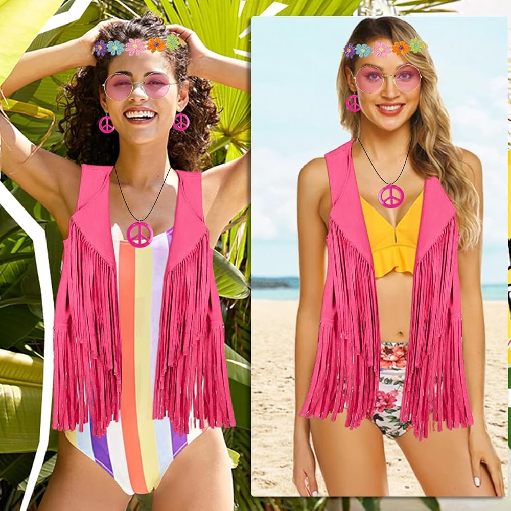 This hippie costume accessories set includes 1 piece sleeveless hippie vest with fringe, 1 pair of bohemian feather earrings, 1 piece boho crystal headband and 1 pair of vintage sunglasses