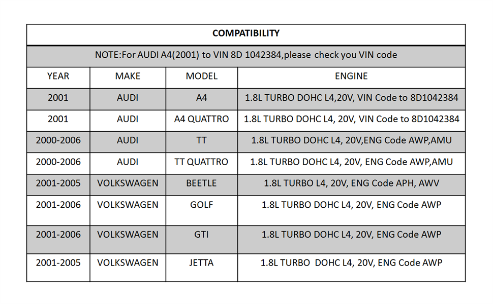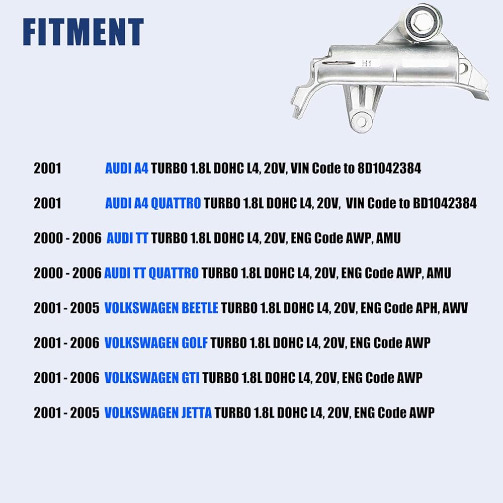 Compatible With: 2001 Audi A4 1.8L; 2001 Audi A4 Quattro 1.8L; 2000-2006 Audi TT 1.8L; 2000-2006 Audi TT Quattro 1.8L; 2001-2005 Volkswagen BEETLE 1.8L; 2001-2006 Volkswagen GOLF 1.8L; 2001-2006 Volkswagen GTI 1.8L; 2001-2005 Volkswagen JETTA 1.8L