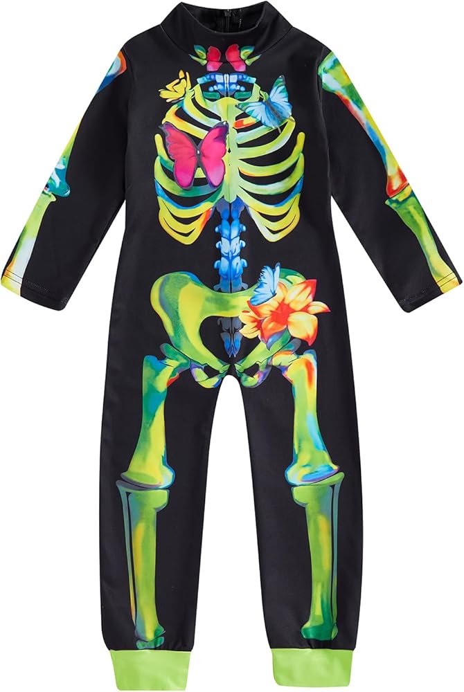 Kids Girls Halloween Costume Back Zipper Long Sleeves Skeleton Jumpsuit for Toddler Cosplay Party Holiday Outfit