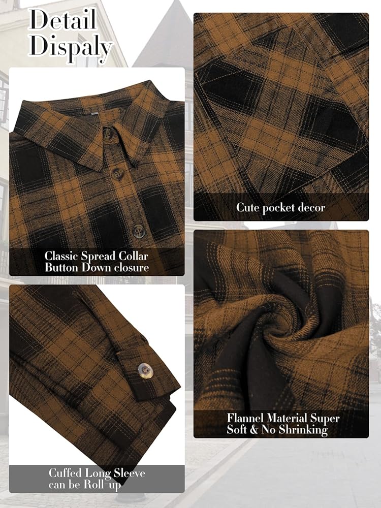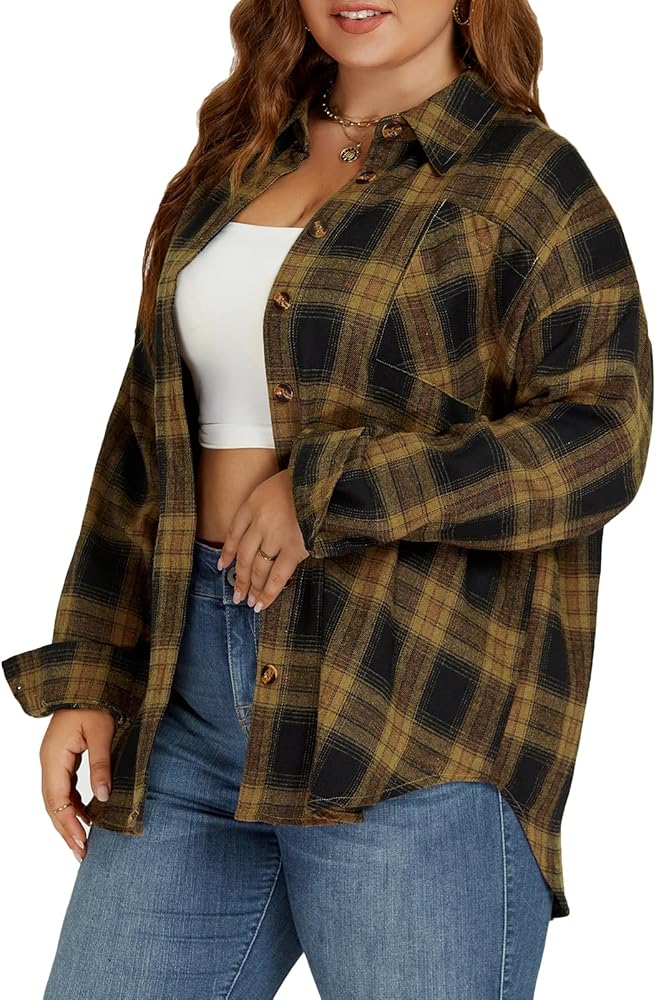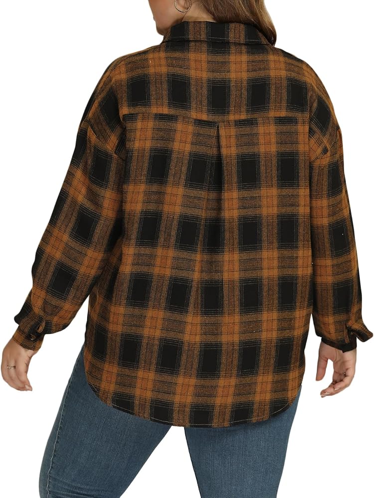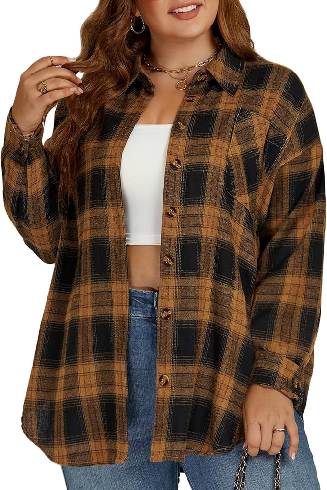 Women plus size flannel shirt with unique drop shoulders design and loose fit oversized style that hide the tummy and hip, the sleeves can be rolled up to be 3/4 sleeves that ensure comfy without binding arms