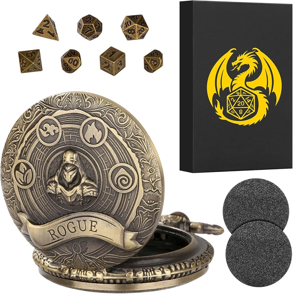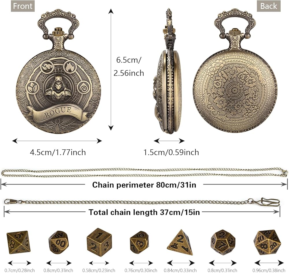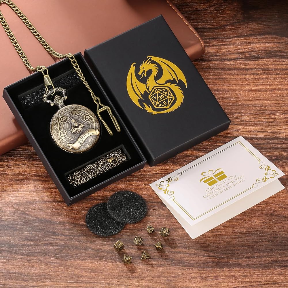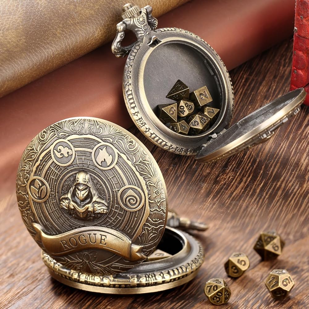 COLLECTIBLE TREASURE: Immerse yourself in the world of rogues and rebels with this exquisite "Rogue's Treasure" miniature DND dice set, housed in a stunning zinc alloy pocket watch case that exudes an aura of mystery and adventure