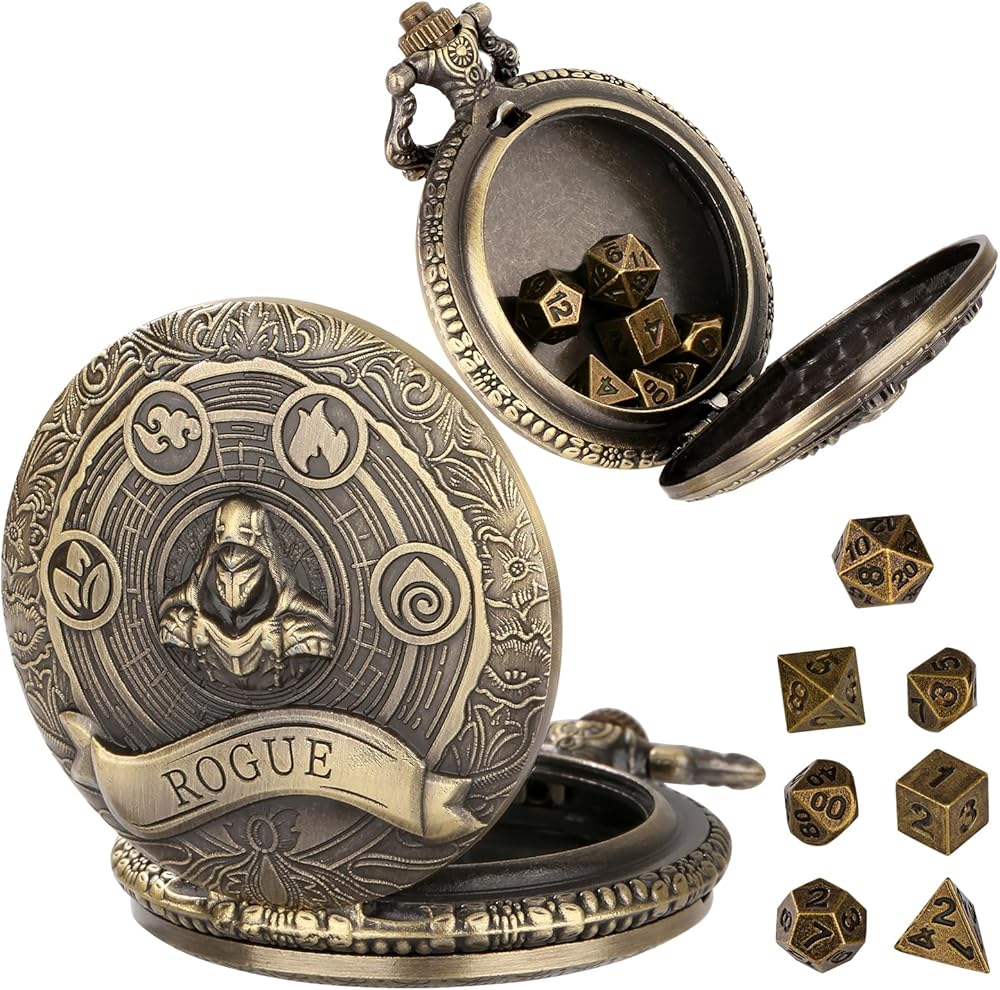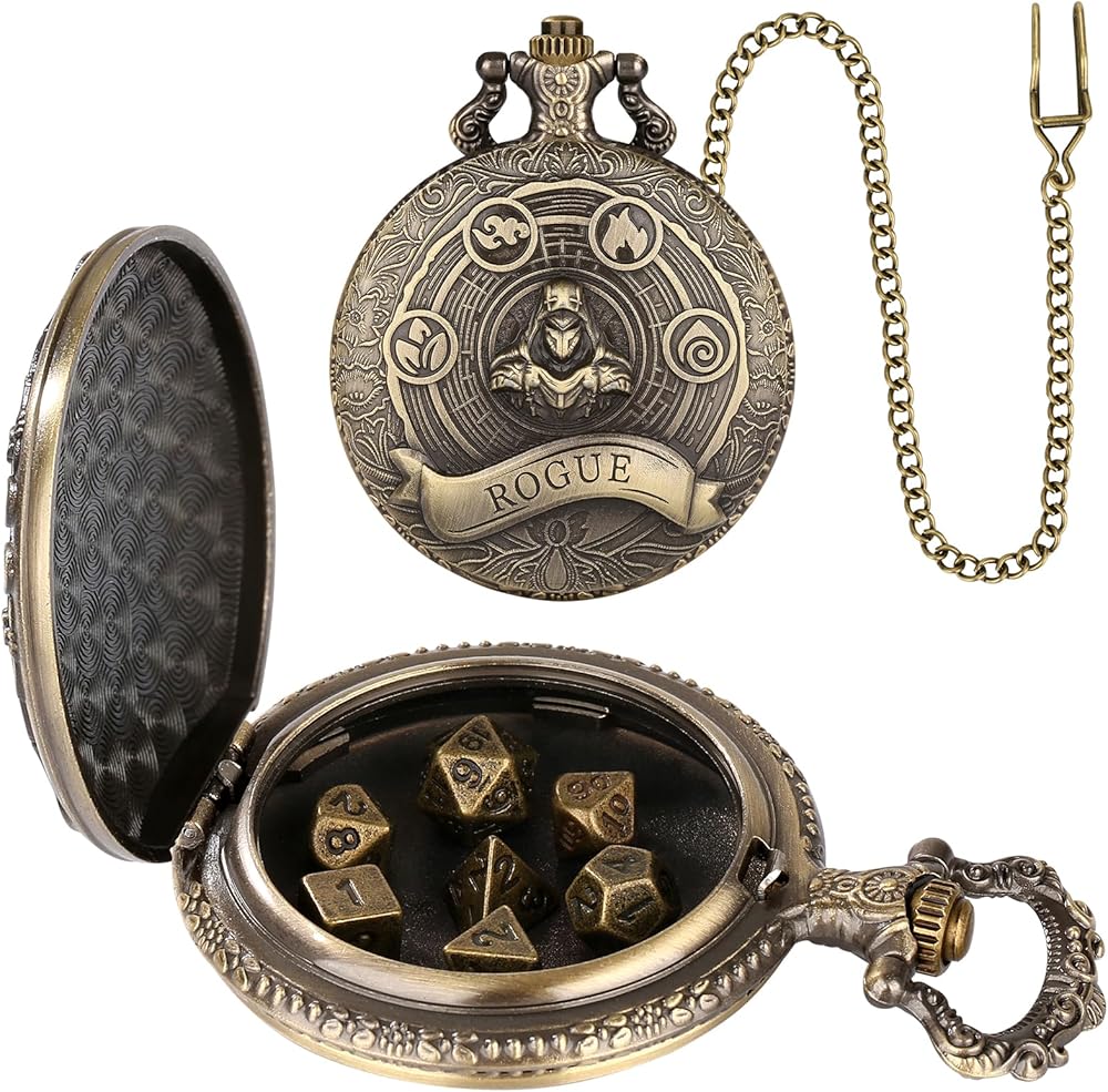 Mini DND Dice Set Steampunk Rogue Pocket Watch Shell Case, 7pcs Polyhedral Metal D&D Dice Set, D&D Gifts with Gift Box for Player, Role Playing Board Games Accessories, Bronze