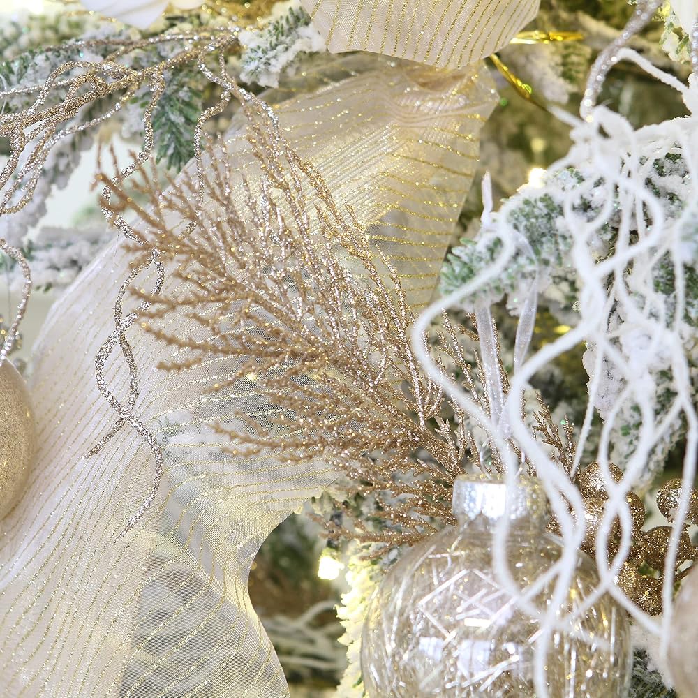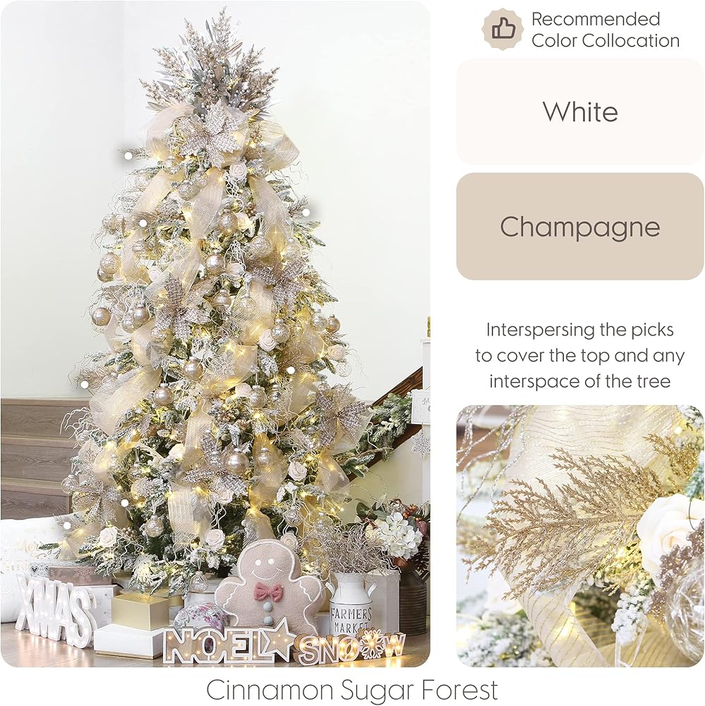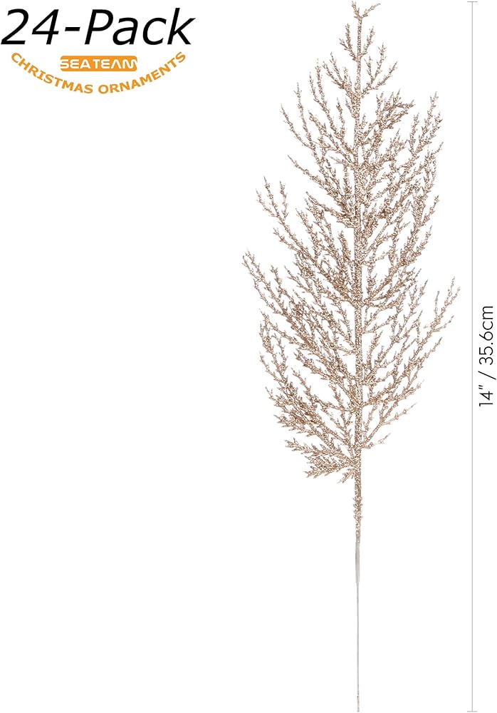 Sea Team 24-Pack Artificial Glitter Pine Tree Twig Ornaments, Decorative Sticks, Glittery Stems, Picks, Branches for Christmas Tree, Small Vase, Holiday, Wedding, Party (14 Inches, Champagne)