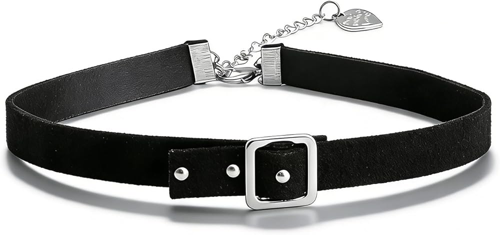 Black Choker:This black leather collar features a Gothic style, featuring a combination of belt buckles and metal chains, showcasing a unique sense of fashion and rugged charm.