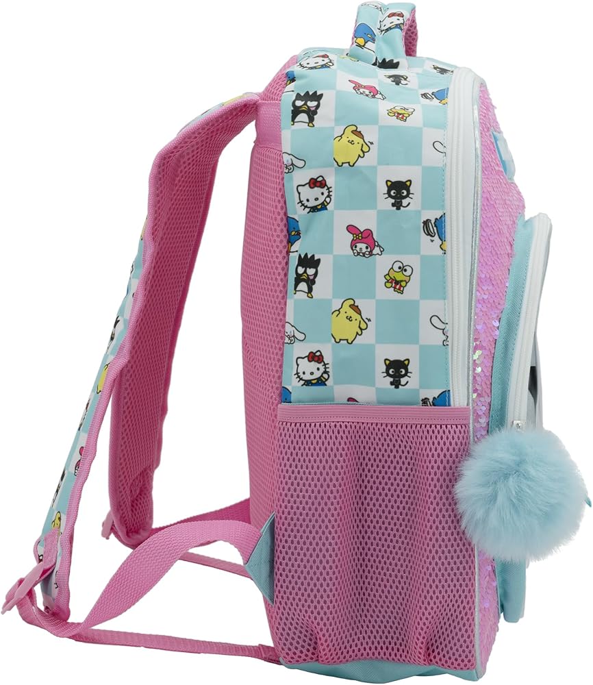 Hello Kitty & Friends Girls Backpack: Take Hello Kitty and all her Kawaii friends on your next adventure with this bright colorful backpack! The backpack features Hello Kitty, Badte, Cinnamoroll, Purin, MY Melody, Tuxedo Same, Chococat on a circular front clear glitter pocket with floating confetti. It has a fun allover character print gusset & back straps along with shiny color change sequin material