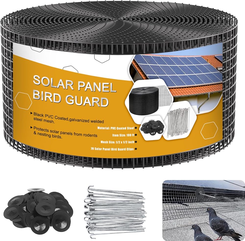 Solar Panel Bird Guard,6in x 100ft Critter Guard Roll Kit for Roof Protection Net Wire Screen,Rust-Proof Black PVC Coated Galvanized Net Pigeon Mesh with 70 Fastener Clips for Bird,Animal Control