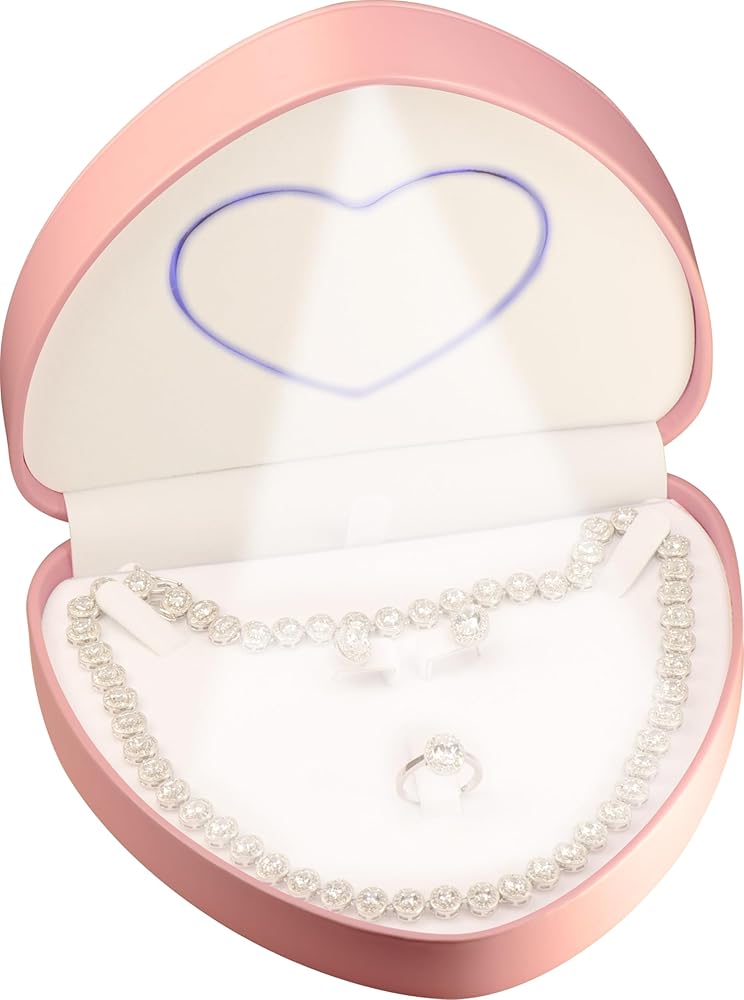 HIGH QUALITY CRAFTMANSHIP FINISH: This LED heart shaped jewelry set gift box is well made with high quality rich PU leather exterior material and the LED light is mounted on top with a perfect angle, this LED heart shaped jewelry set box will make your wedding engagement jewelry sets gifts look luxury and brings a glowing and sparkling looking.