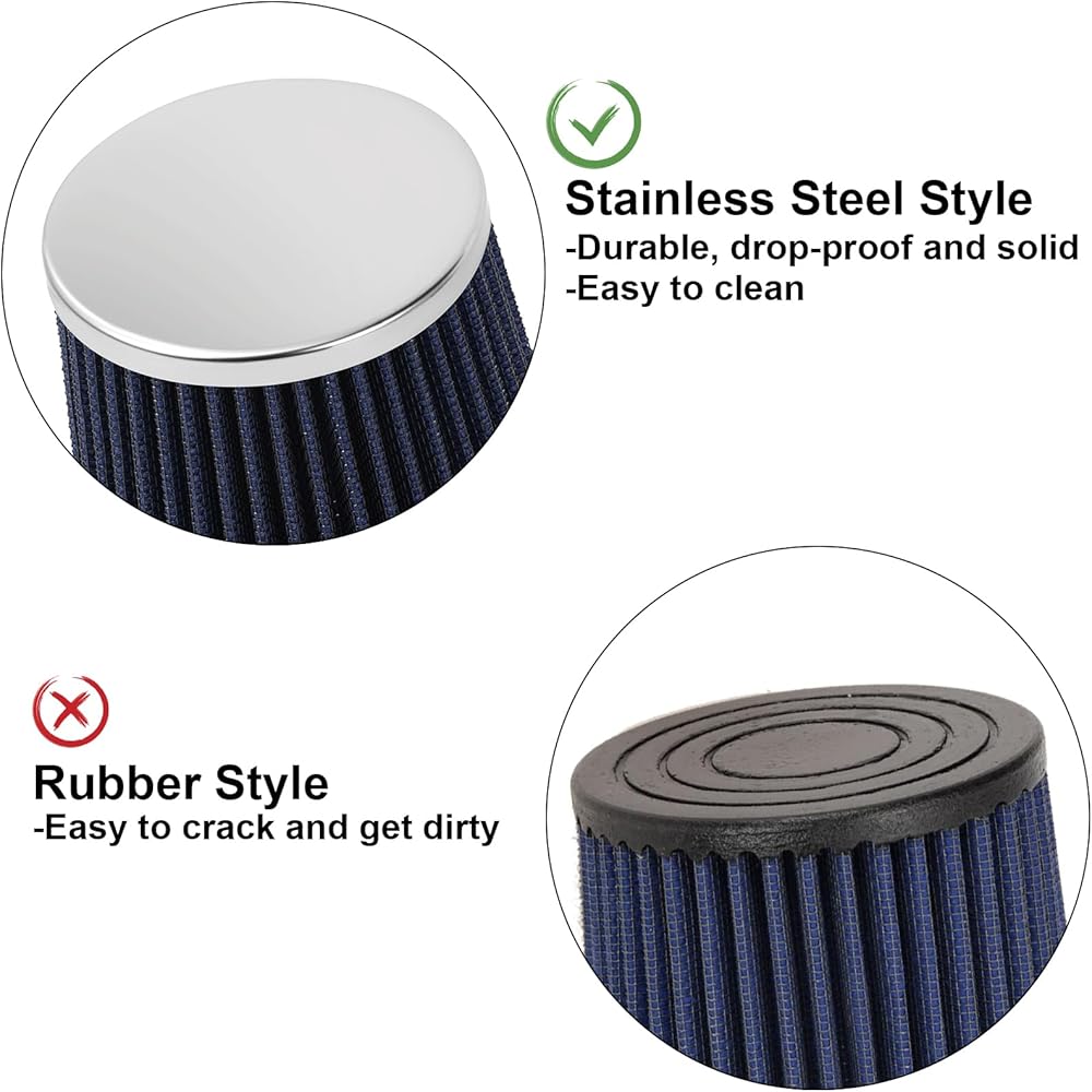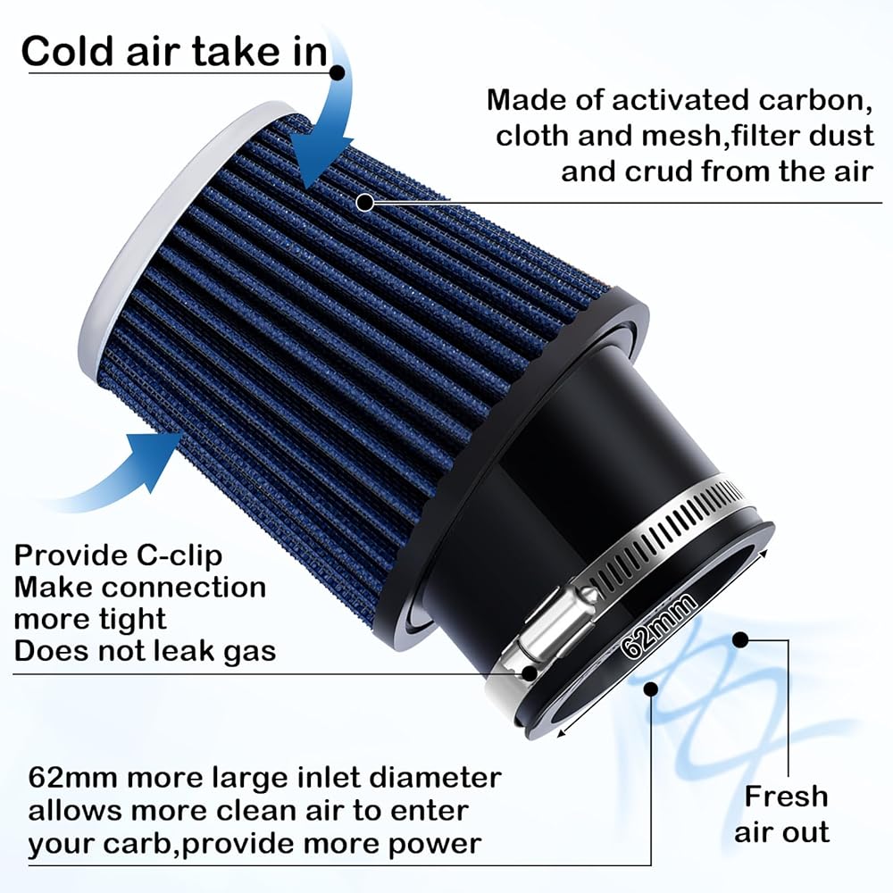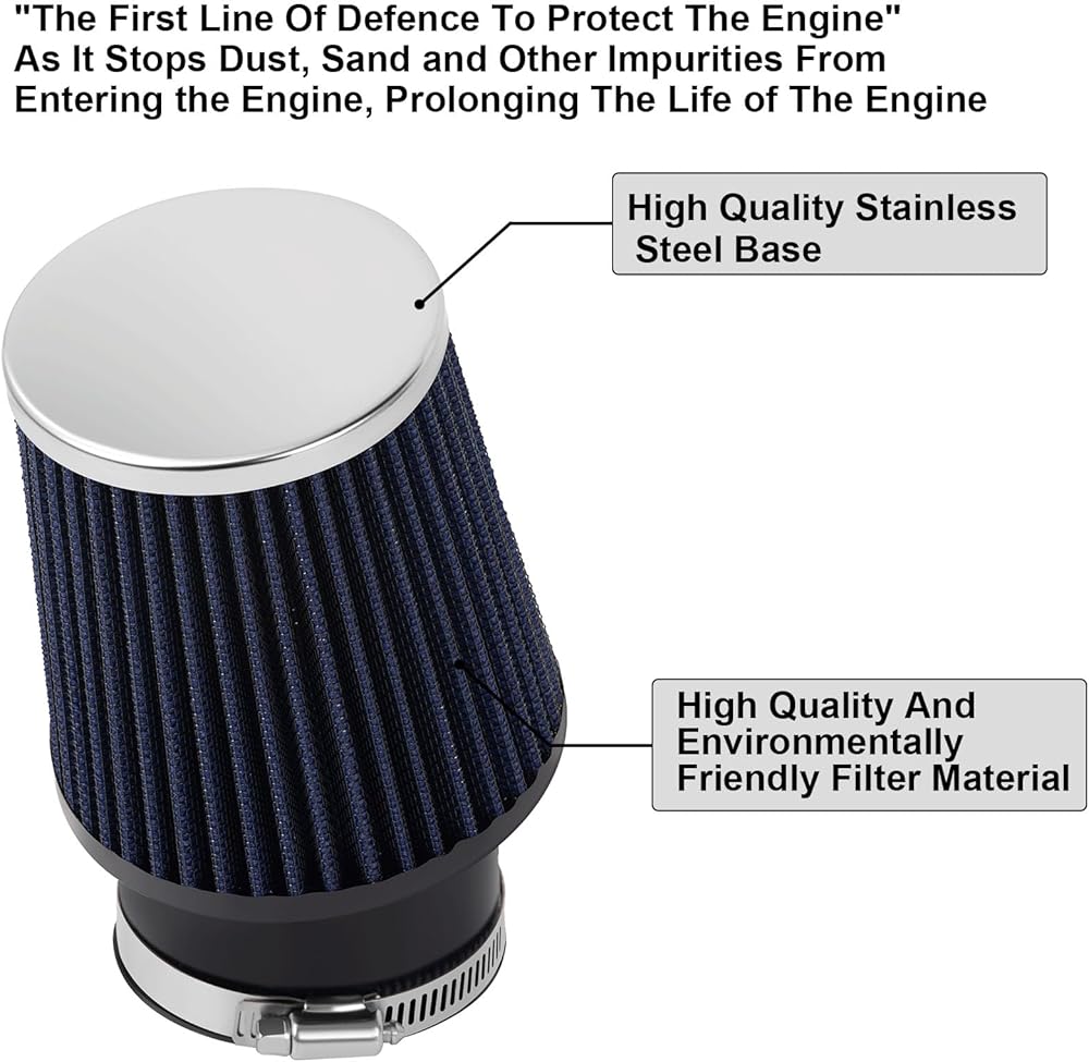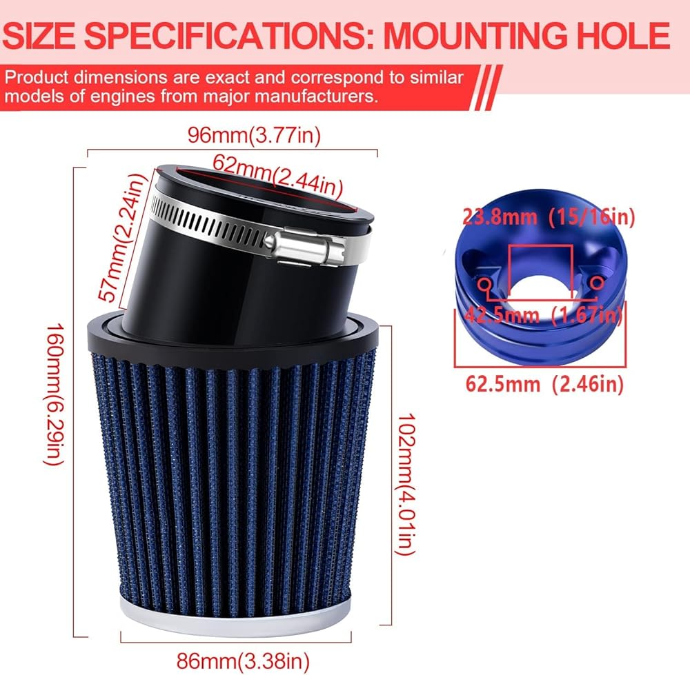 DIMENSIONS - Air Filter: Maximum Diameter: 3.74in, Top Diameter: 3.35in, Inner Diameter of Rubber Intake: 2.44in, Outer Diameter of Rubber Intake: 2.91in, Height: 5.78in. Intake Adapter: Hole Spacing: 1.67in, Length: 2.46in, Width: 2.46in, Height: 1.22in.