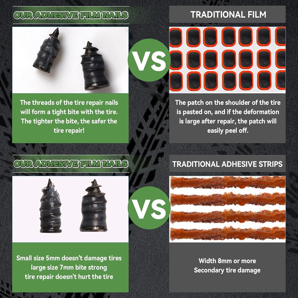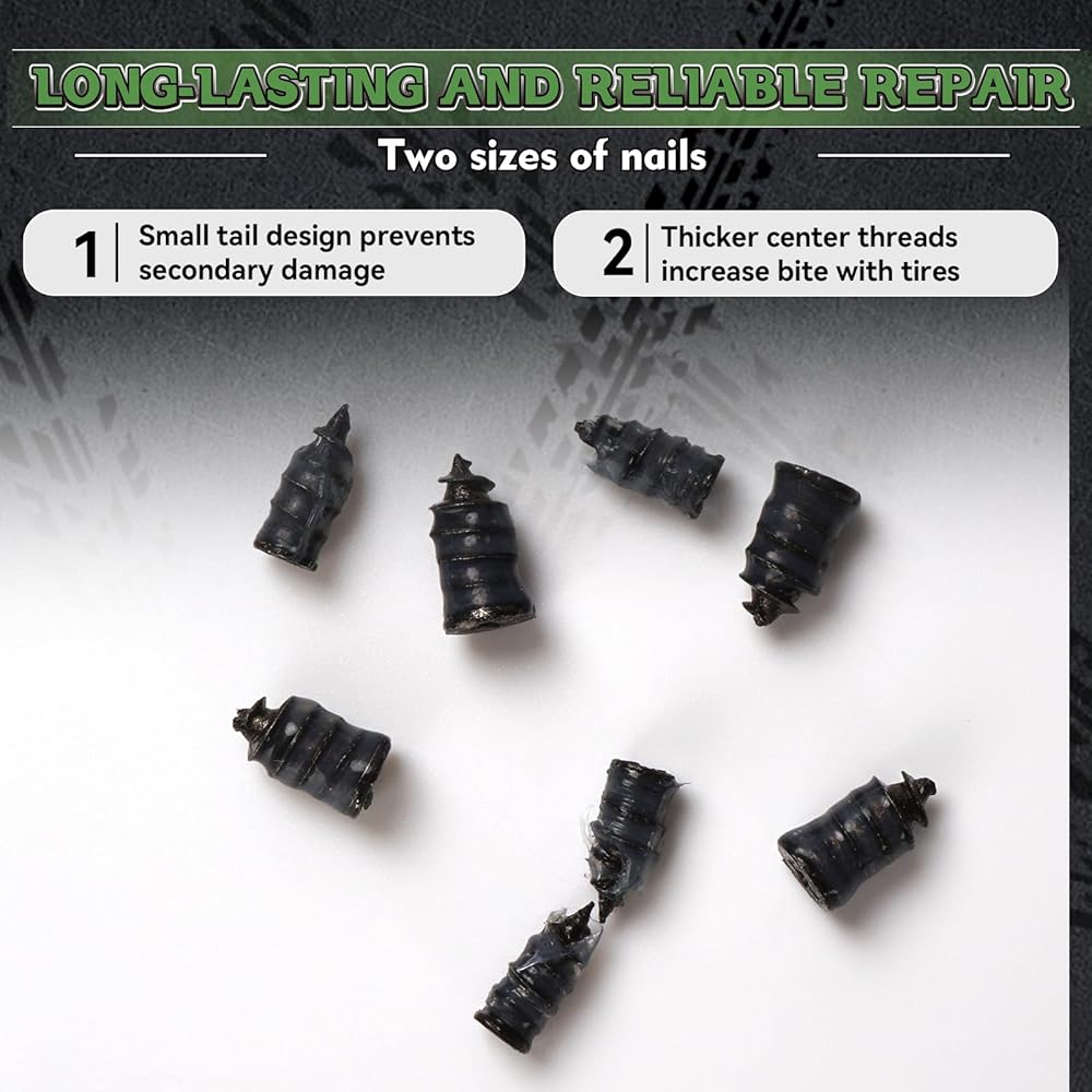 Two sizes of tire repair nails: The rubber cement tire repair glue is equipped with two sizes of alloy tire repair nails, which are designed with small tails and thickened threads to increase the bite force between the screws and the tire without causing secondary damage to the tire. Two sizes of screws are designed for different levels of tire punctures. Achieve good repair effect